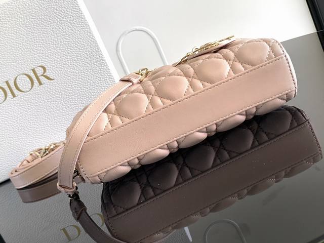 这款 Lady D-Joy 手袋凸显 Lady Dior 系列的简约美学,集中体现了 Dior 对优雅和美丽的深刻洞见。采用黑色羊皮革精心制作,饰以藤格纹缉面线,搭配浅金色饰面金属 D.I.O.R. 吊饰提升格调,为精美的轮廓增添一分灵动。小号款式,搭配可拆卸的链条肩带和可调节、可拆卸的皮革肩带,可手提、肩背或斜挎,是日常造型的理想之选。