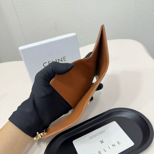 celine新款卡包,Triomphe名片包,牛皮大面内配平纹超纤,金色饰面Triomphe金属按扣开合,1个加厚主隔层,3个内侧卡槽。...