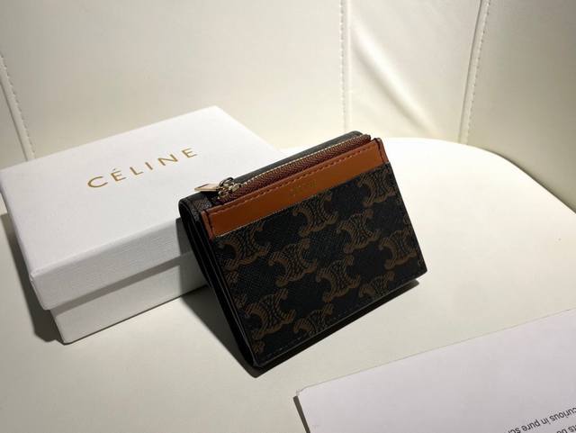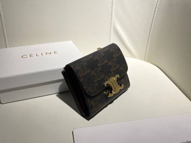 Celine新款卡包,Triomphe名片包,经典花纹大面内配平纹超纤,金色饰面Triomphe金属按扣开合,1个加厚主隔层,3个内侧卡槽。...