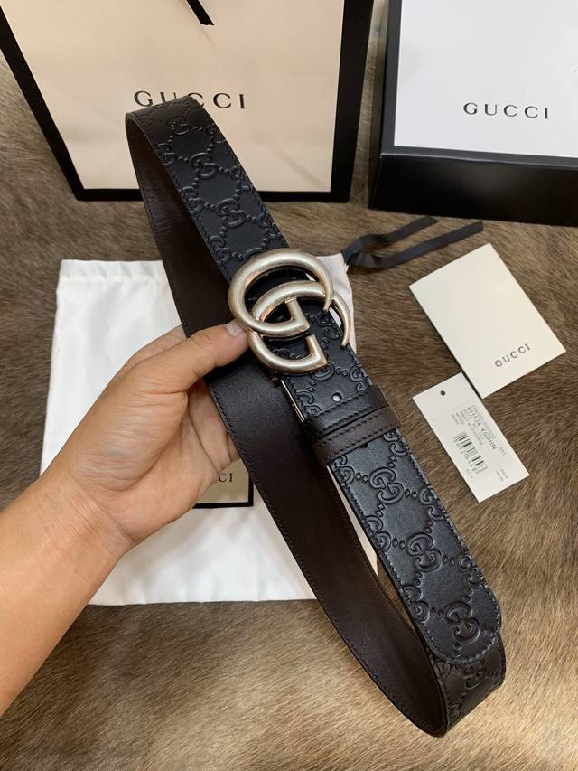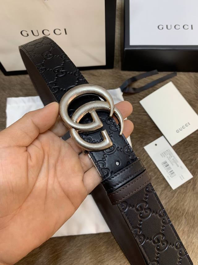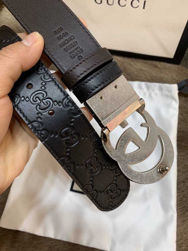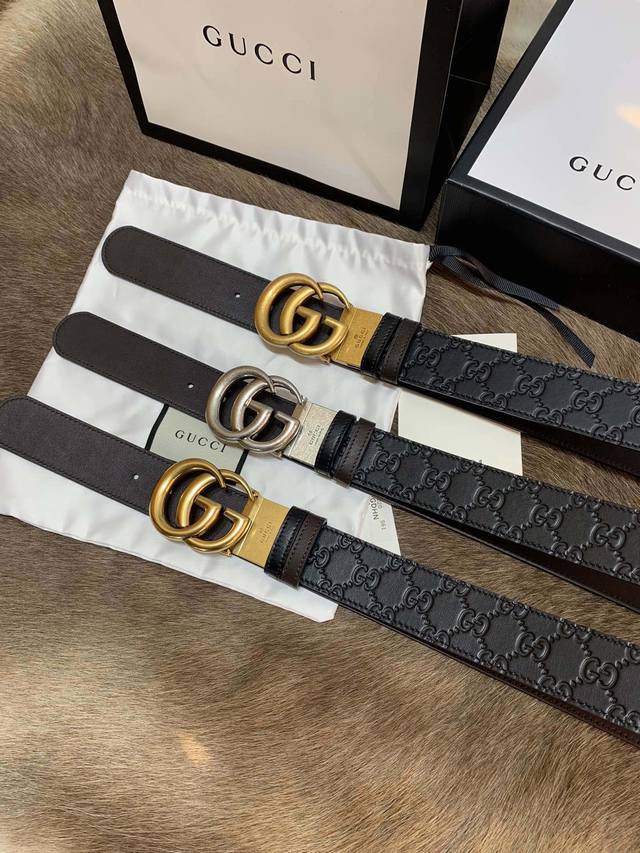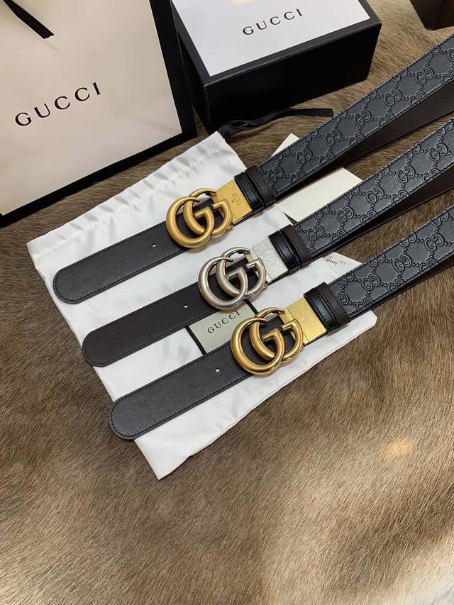 回货 原**单品质 配全套包装 谷奇男士双面使用腰带 两面用旋转男款双*G头腰带 精品铜扣3层真空电镀; 双面头层牛皮一面压花g、一面平纹 ,宽度3.7Cm商务、休闲百搭款