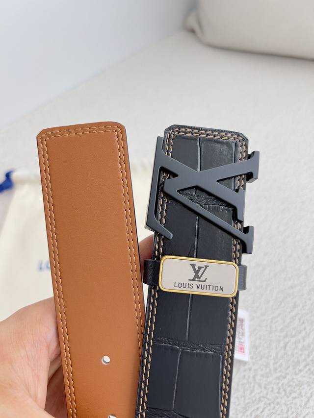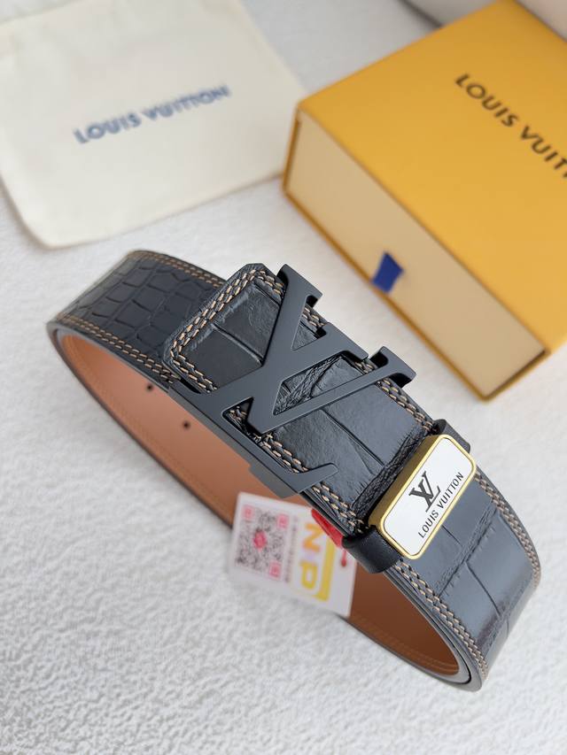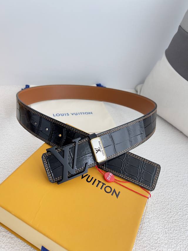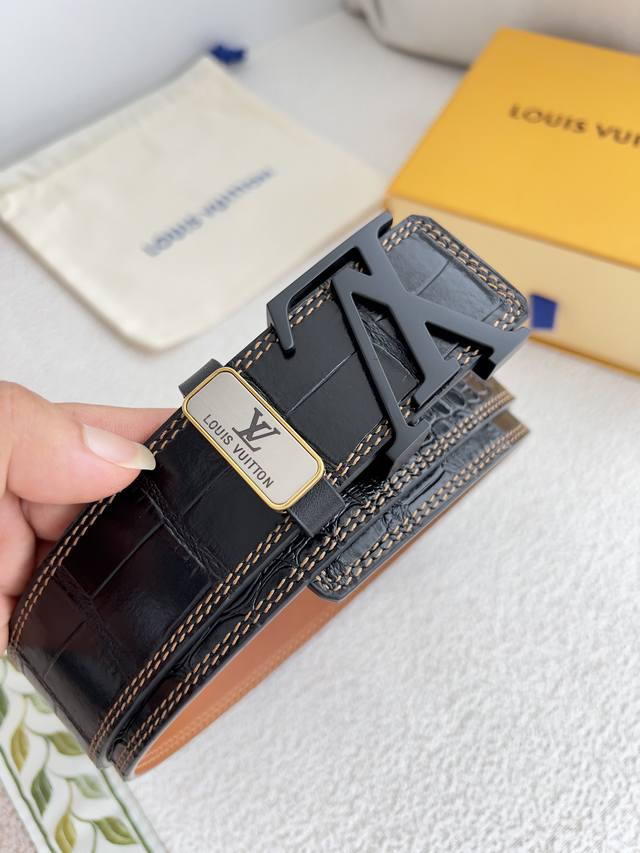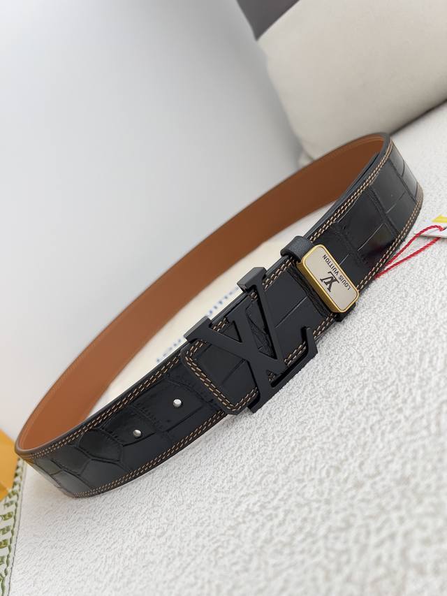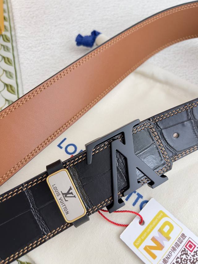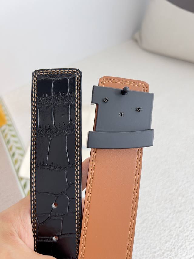 材料:头层牛皮,挂扣系列,纯钢材质扣头,钯镀电镀工艺永不掉色。原版经典头层牛皮双线鳄鱼纹黑土黄头层牛皮平纹底,黑扣,可双面使用,纯钢材质扣头,专柜同等质量,送人自用首选