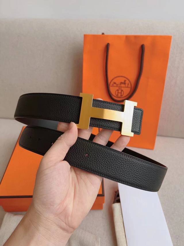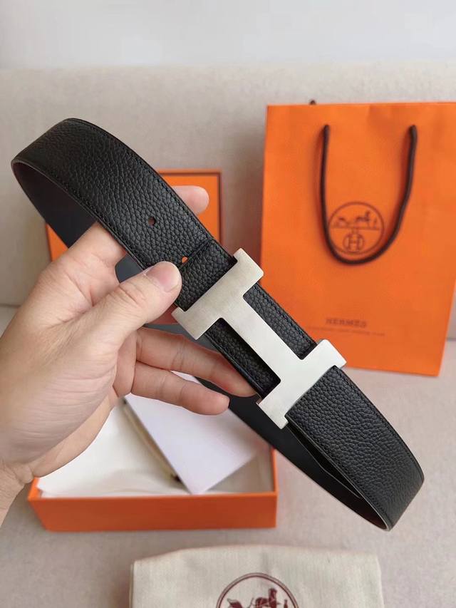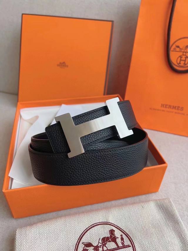 爱马仕皮带进口头层荔枝纹牛皮,搭配原单新款18K钢扣扣头,双面可用,一面黑色 一面咖啡...
