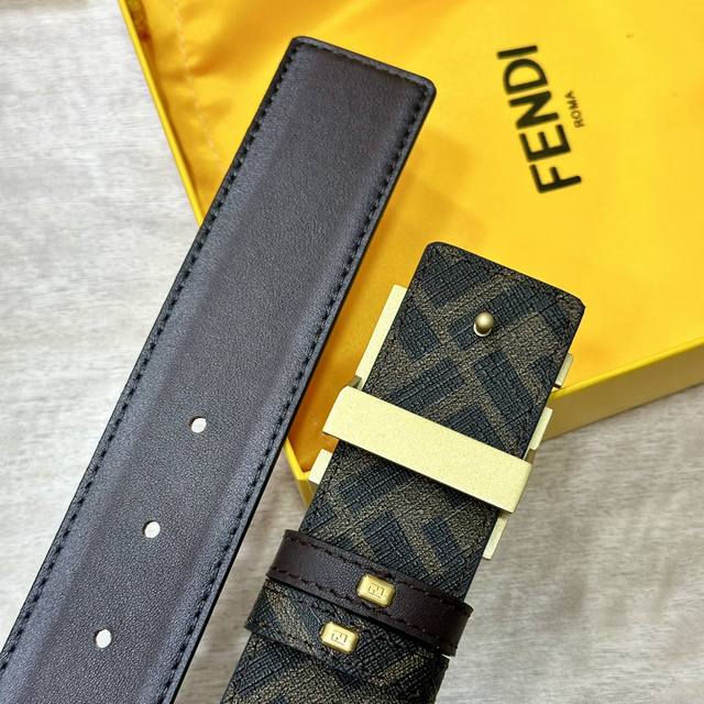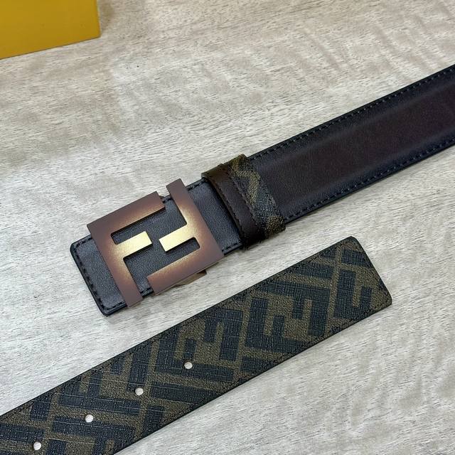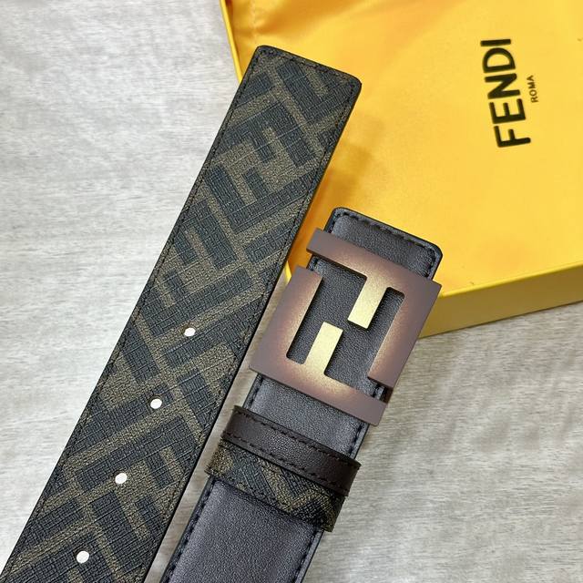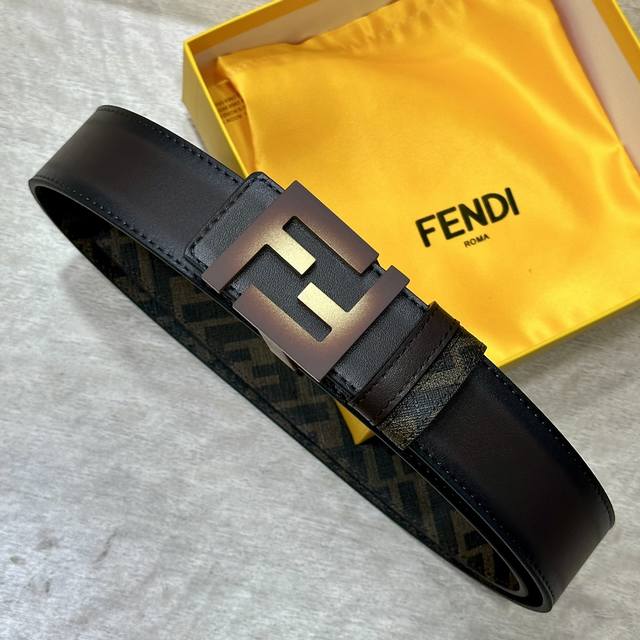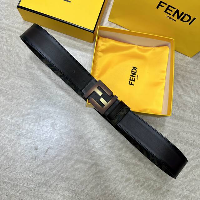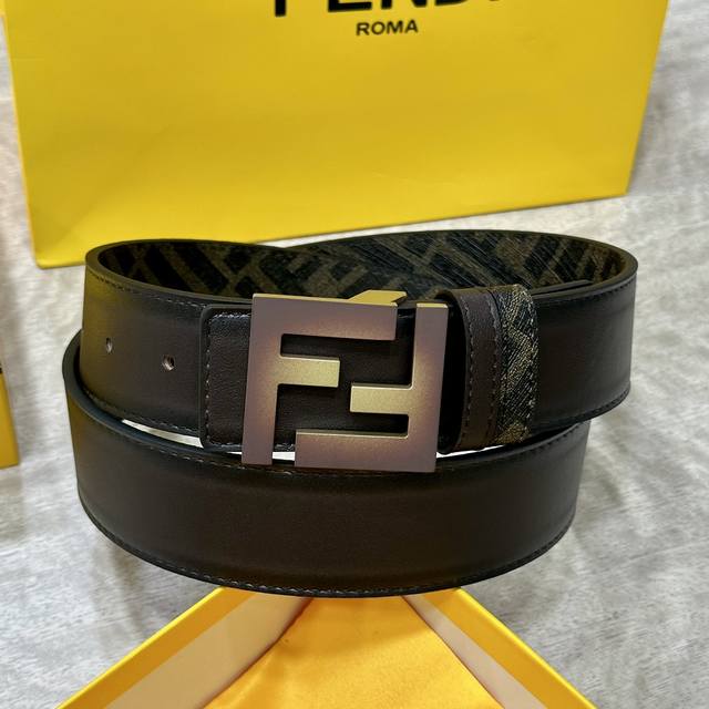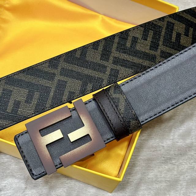 / Fendi 芬迪 全套包装 专柜同款 宽4.0Cm 双环正反用腰带 Ff按钉搭扣 双色cuoio Romano皮革材质 反面面料带有烟草黄和黑色ff图案 黑色珐