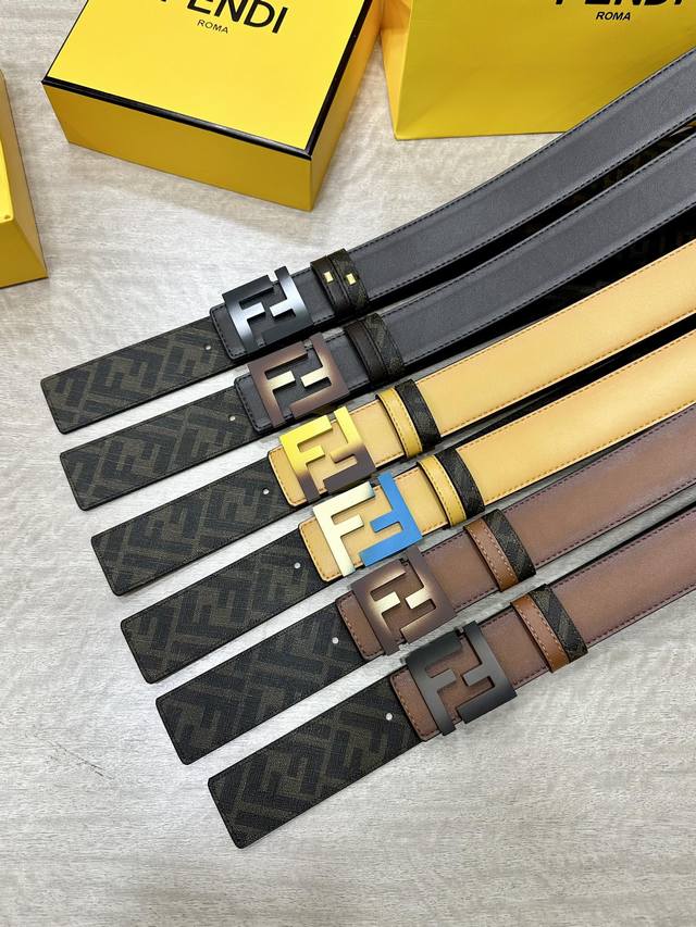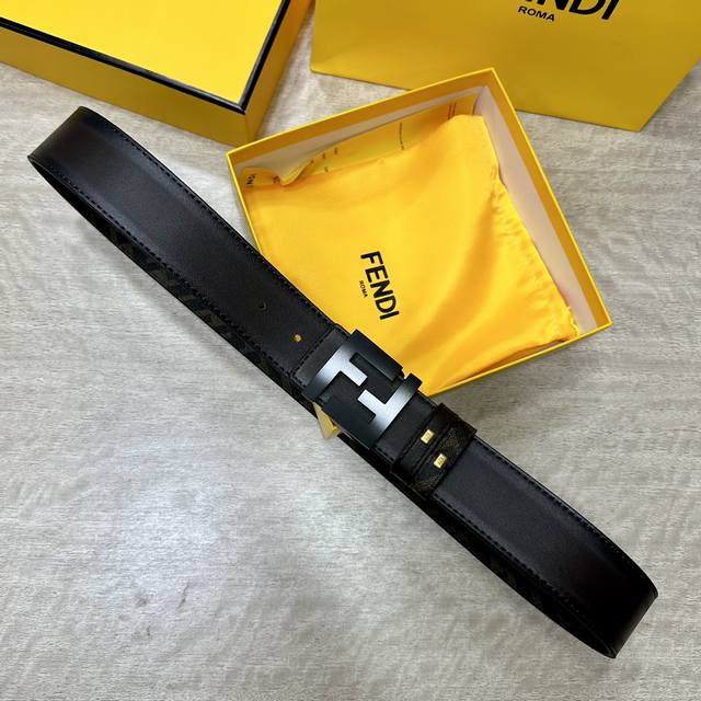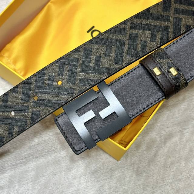 / Fendi 芬迪 全套包装 专柜同款 宽4.0Cm 双环正反用腰带 Ff按钉搭扣 双色cuoio Romano皮革材质 反面面料带有烟草黄和黑色ff图案 黑色珐