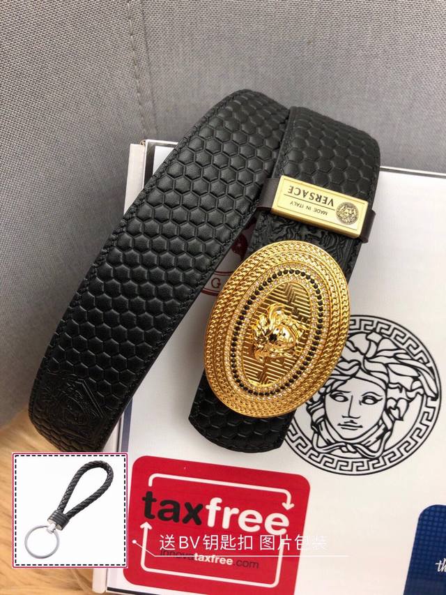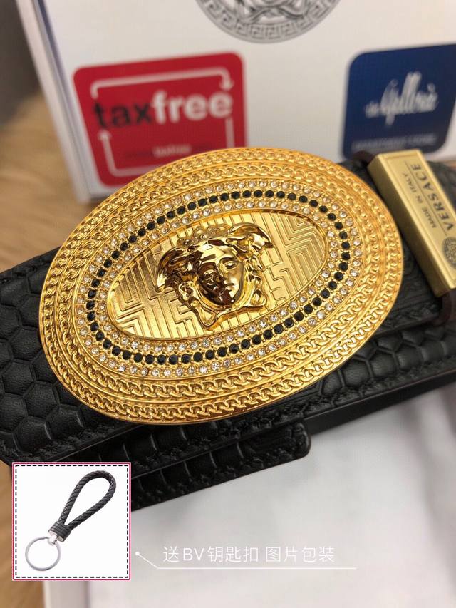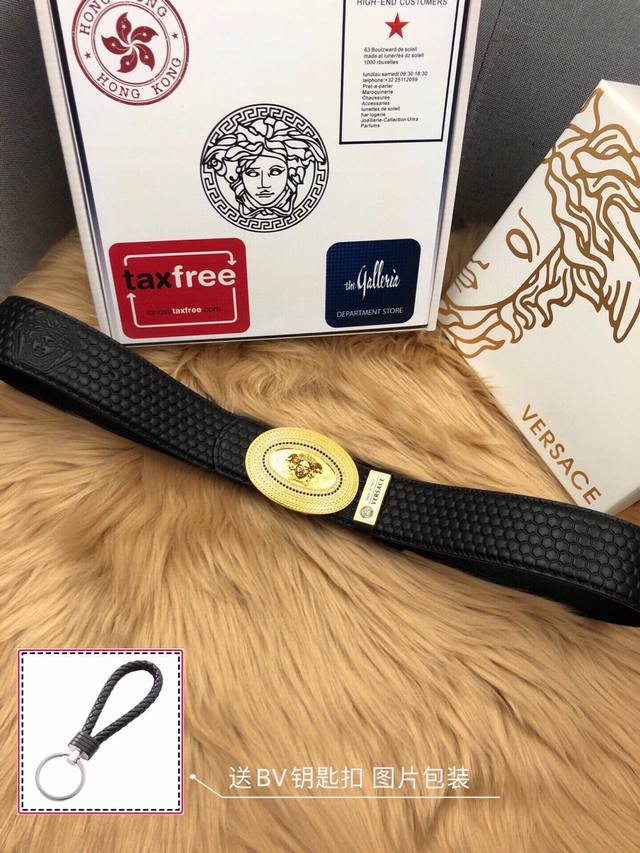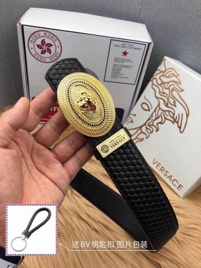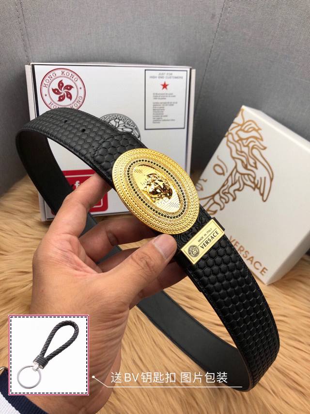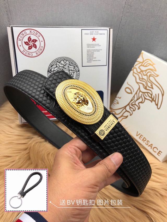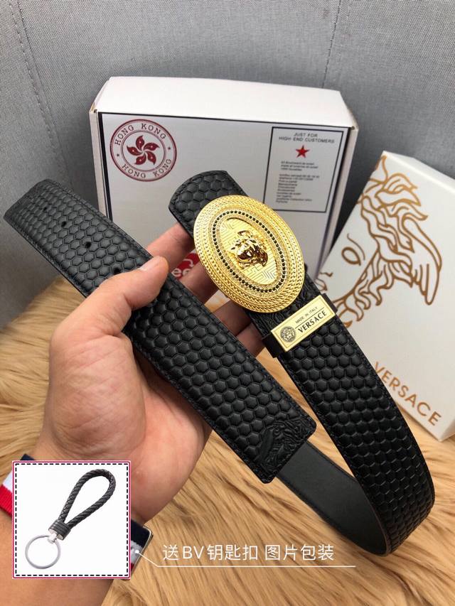 Versace 范思哲 皮带美人头压花牛皮带身,精致五金扣头做工精细,奢华高贵款式,结实的皮带,腰带可搭配从西裤到休闲装各种服饰。宽度:3.8Cm-精磨细打-做工无可挑剔送bv编织钥匙扣