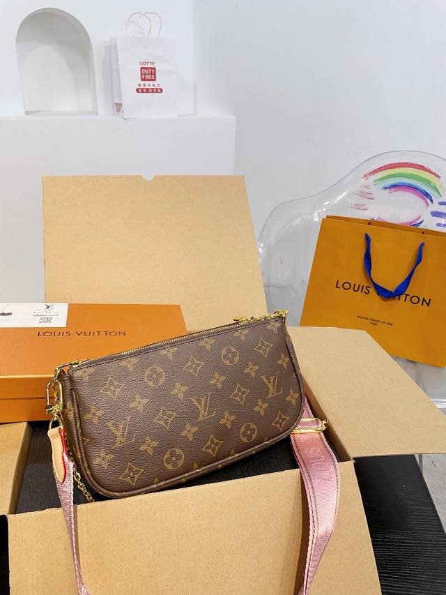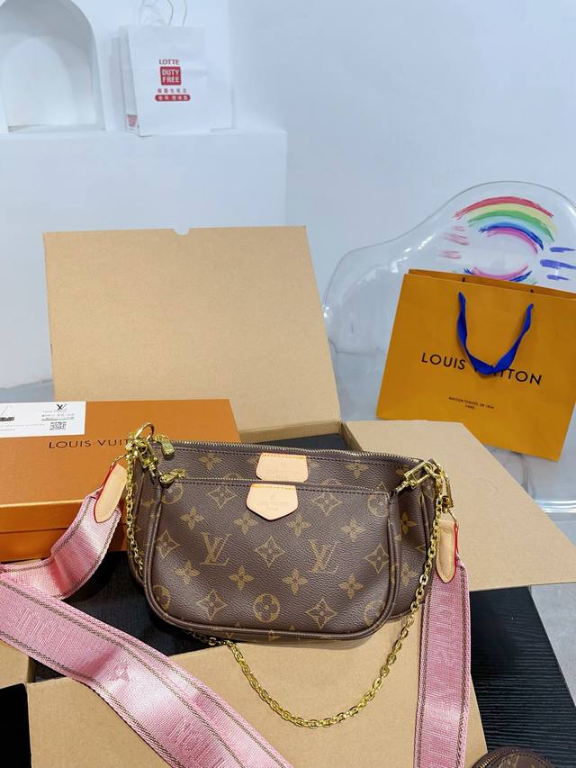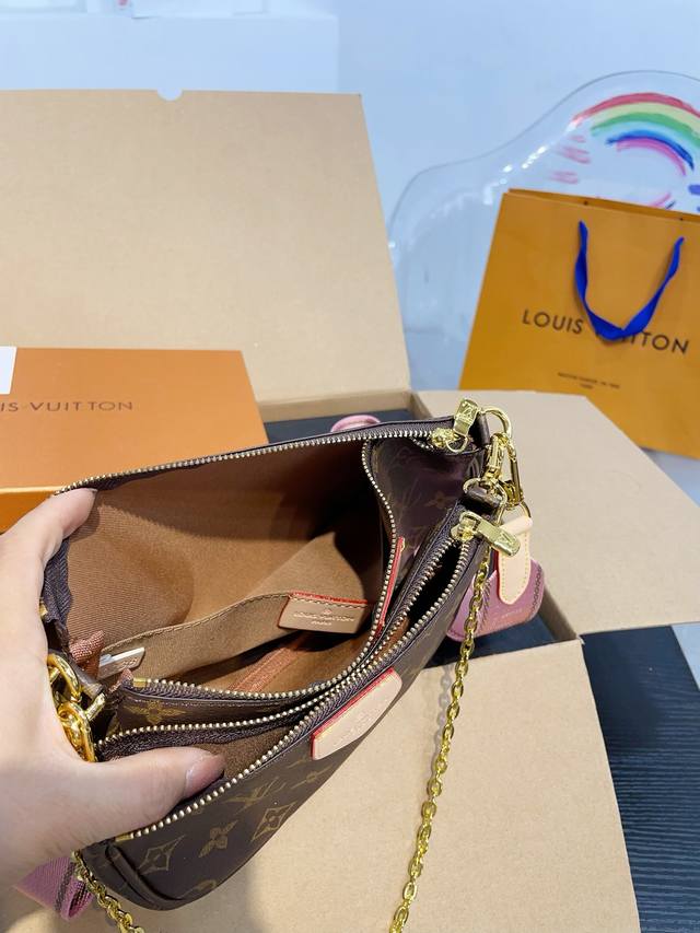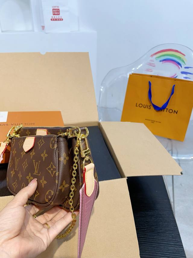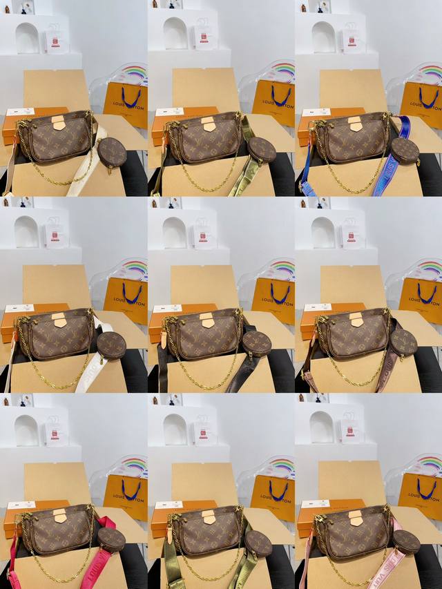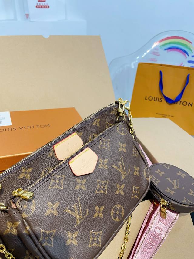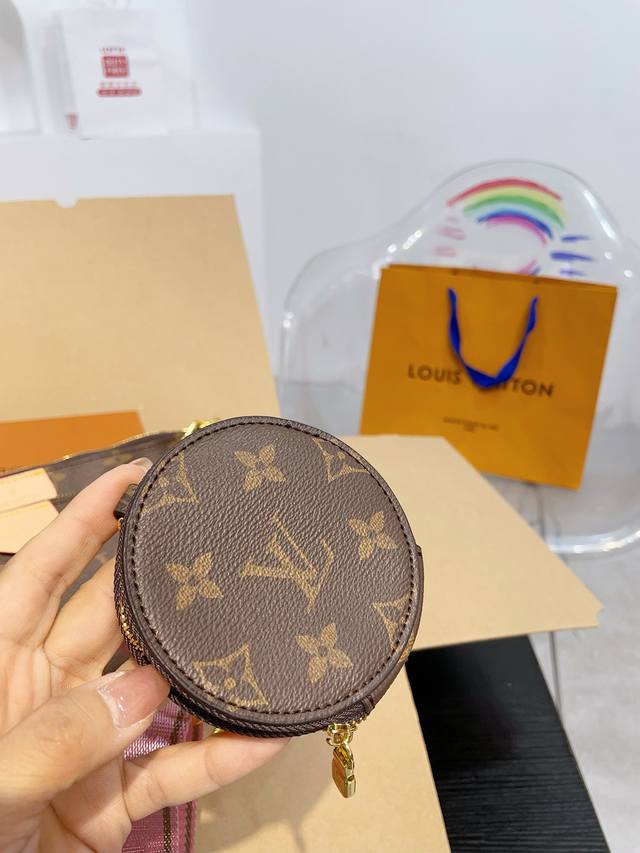 Lv三件套麻将包 柔软的monogram面料+纯钢五金一包四用。可当钥匙包。小容量零钱包、大容量麻将包,编织肩带还可以与其他包包搭配使用。钥匙包可以用来当配饰。秀气的链条小包可单肩可斜挎。超级实用。新颖别致 尺寸:大包23*13Cm 、小包18*11Cm 、圆饼包10Cm