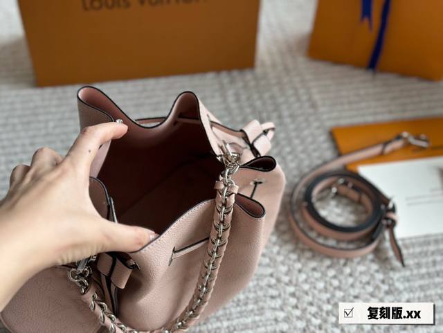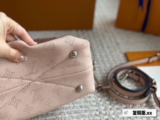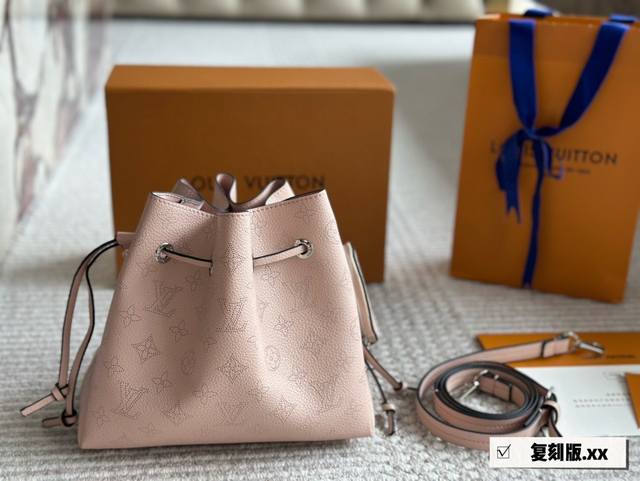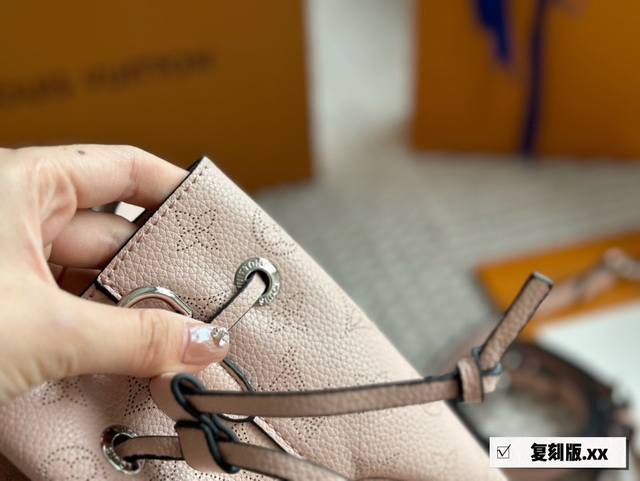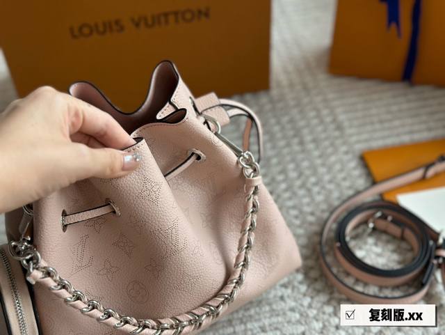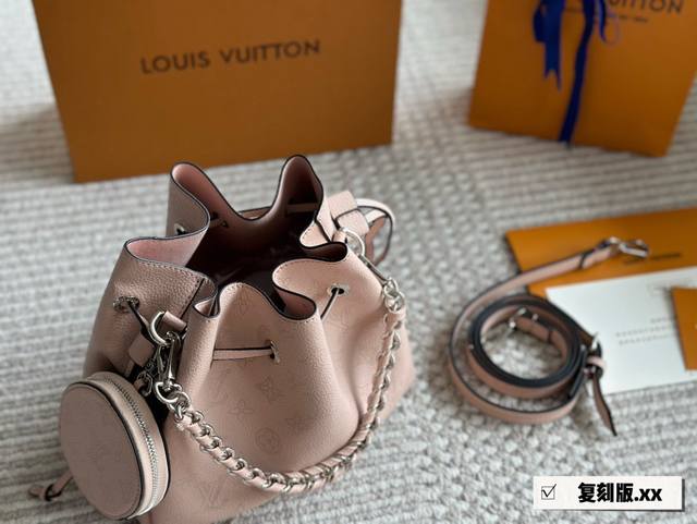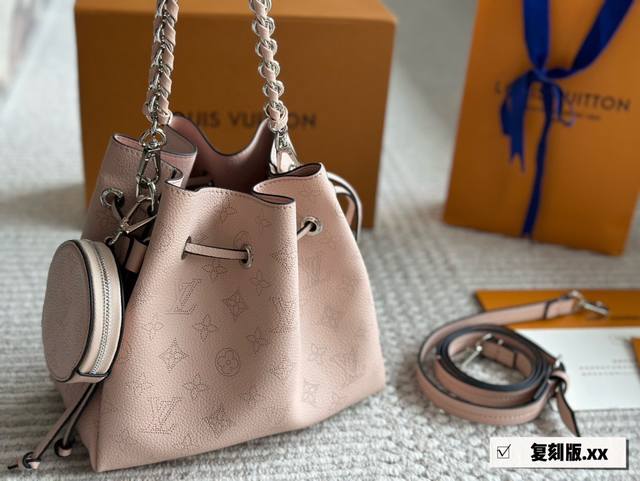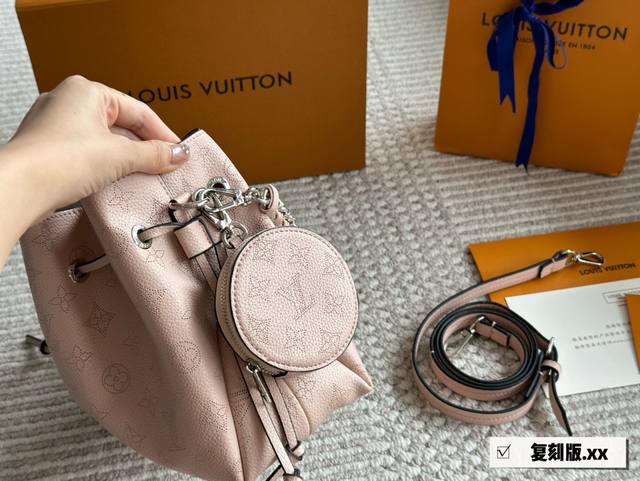 Lv高版本 Bella 小水桶 手袋系列 采用monogram镂花穿孔小牛皮塑造小巧构型,再令相同图案以袖珍比例栖身圆形零钱包,洋溢摩登风尚。金属与皮革编织手柄和可拆卸皮革肩带实现多种背携方式。尺寸22 18Cm