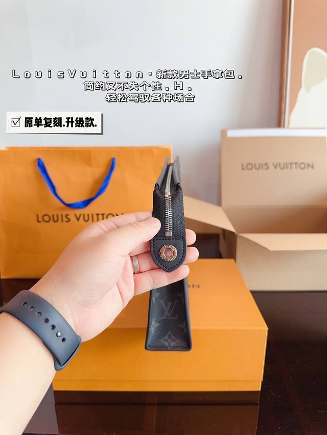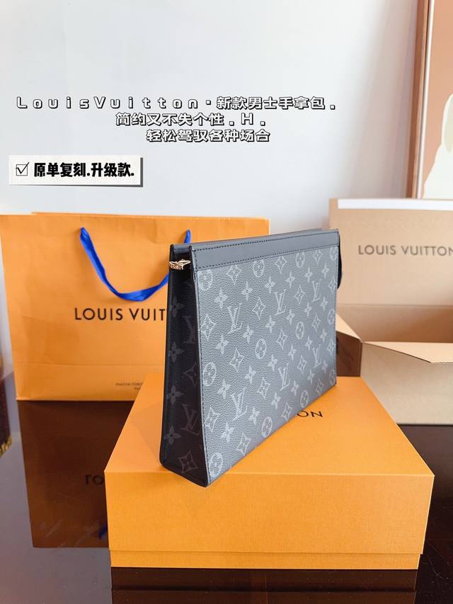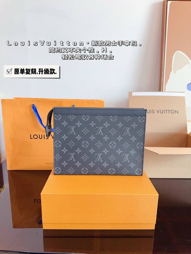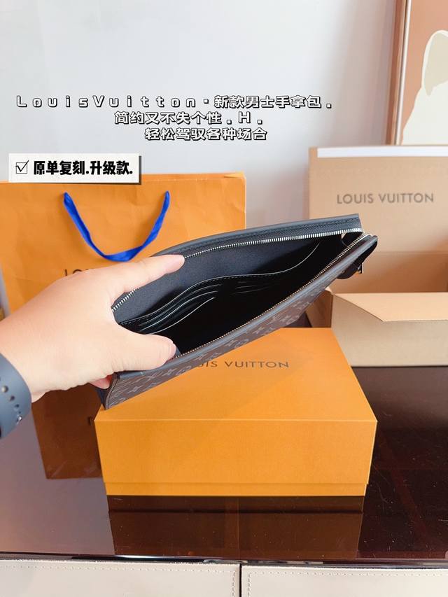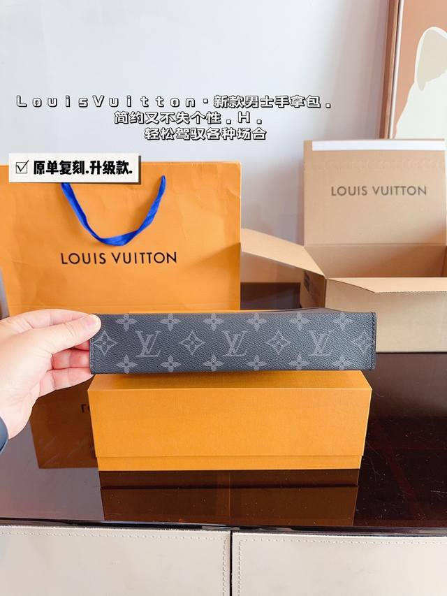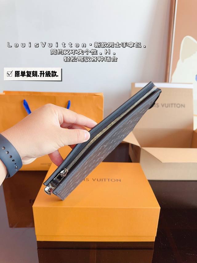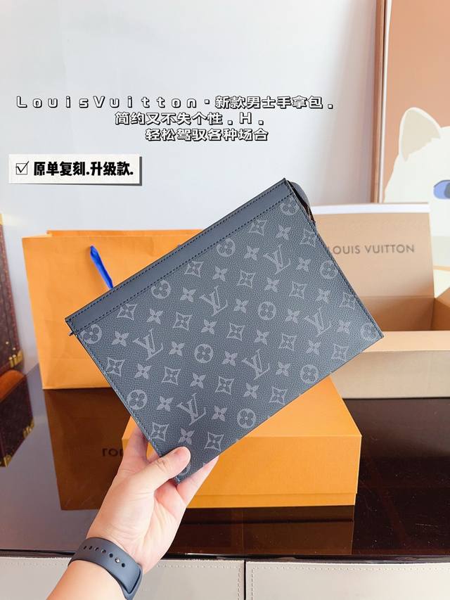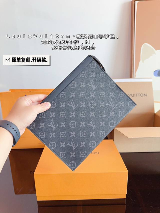 Lv 路易威登手拿包 其实包包本身是个洗漱袋化妆包 被拿来用做手包 一般的手包都是扁扁的 但是这款手包底部是宽的 虽说是个手包 但能放很多东西进去 而且不变形 拿在手上非常有型 火爆的不行不行的 真的很经典 尺寸:27*5*20Cm