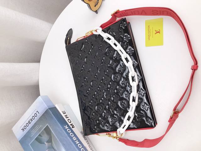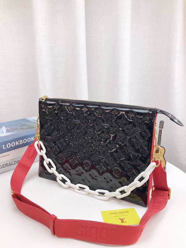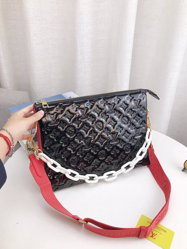 高品质漆皮lv Coussin 抱抱包 Monogram 压纹蓬松纯皮 打造靠枕构型,为简约设计注入前卫风范。可利用肩带斜挎或化身链条法棍包,亦可于腋下携带。尺寸:33*25Cm