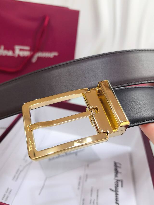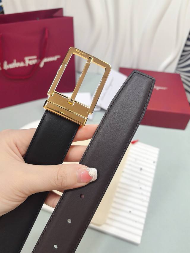/ 菲拉格慕原版同步,针扣系列,双面皮带风格优雅,采用双饰面设计,时刻保持考究格调,双面牛皮,呈现前卫醒目的边缘效果。Gancini扣饰配以对比感饰边,连接处缀饰标