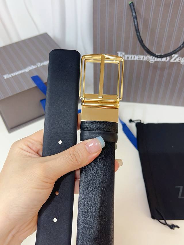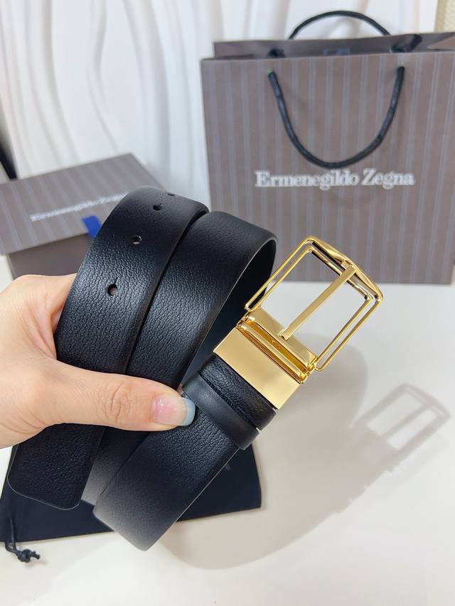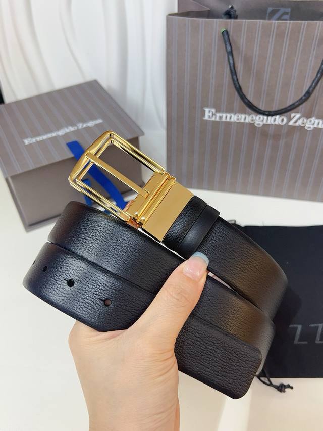 / 杰尼亚顶级原单精品,两种纹理可供选择,从而与各种服饰任意穿搭:黑色皮革双面皮带一侧采用 Stuoia 雕纹皮革,另一侧采用光滑皮革。搭扣点缀深钌色饰面,让这款双