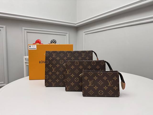 顶级原单 M47195三件套 Trio 盥洗袋为 Monogram 帆布搭配明丽可水洗内衬,再以莹亮金属件点睛工致细节。尺寸:25 X 20 X 5.5 厘米