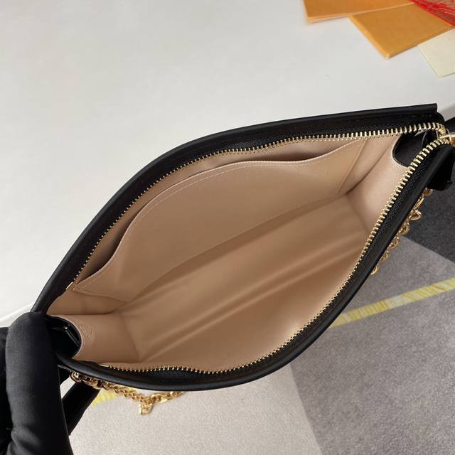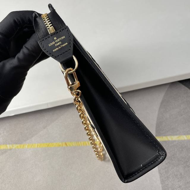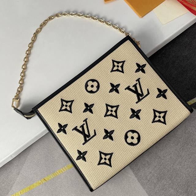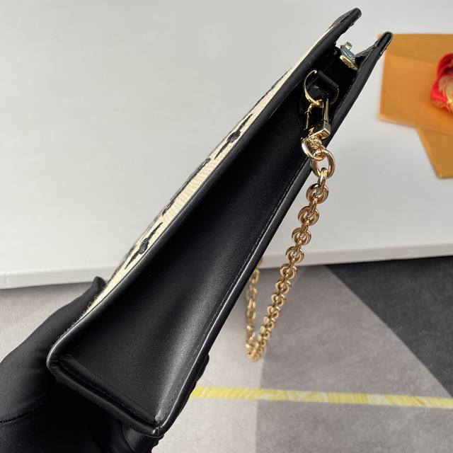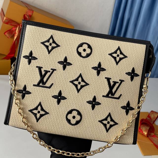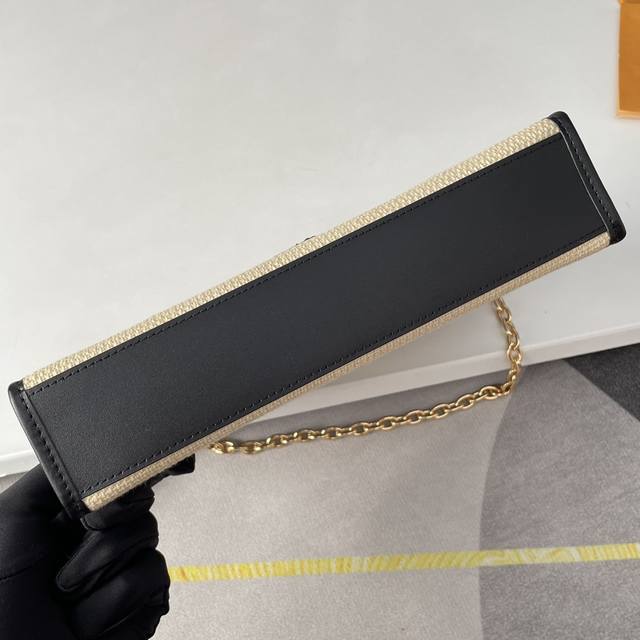 顶级原单m82521独家实拍!编织草席链条化妆品袋由天然棉制成,带有黑色字母组合图案和协调的皮革装饰。这个模型的灵感来自1901年创建的poche Toilette化妆袋,路易威登的客户也将其用作手拿包。这种重新设计有一个可拆卸的金色链条,用于手提或肩部携带。尺寸:25×20×5.5Cm