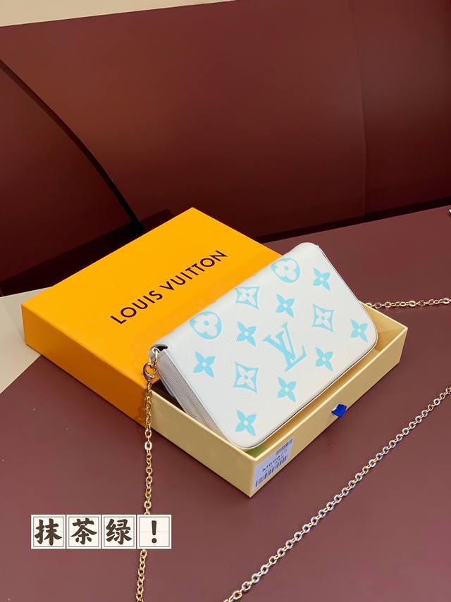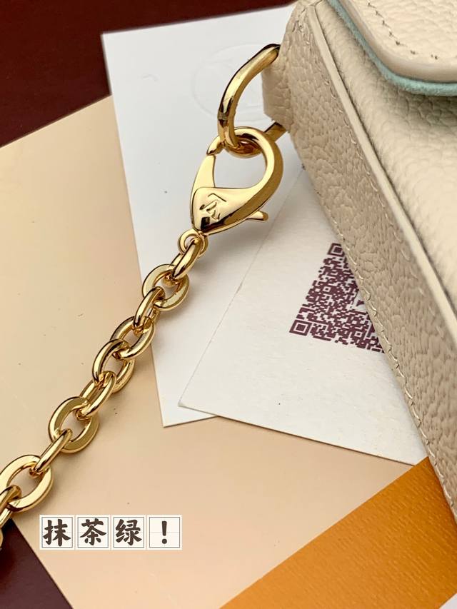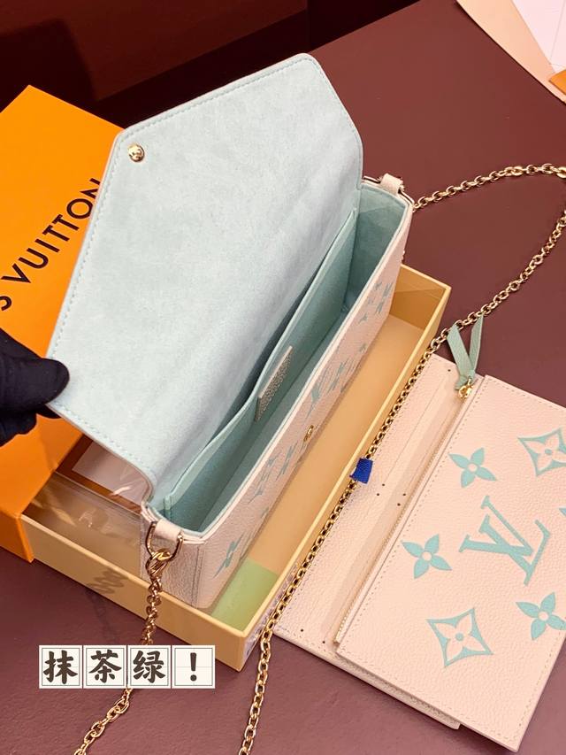 出厂价 M69977 抹茶绿!三件套、本款 Pochette Félicie 链条包为 Monogram Empreinte 皮革描绘 Monogram 印花,其信封式构型包含可拆卸内袋。系上链条即可完成手拿包和肩背包的随心转换。尺寸:21.0 X 12.0 X 。