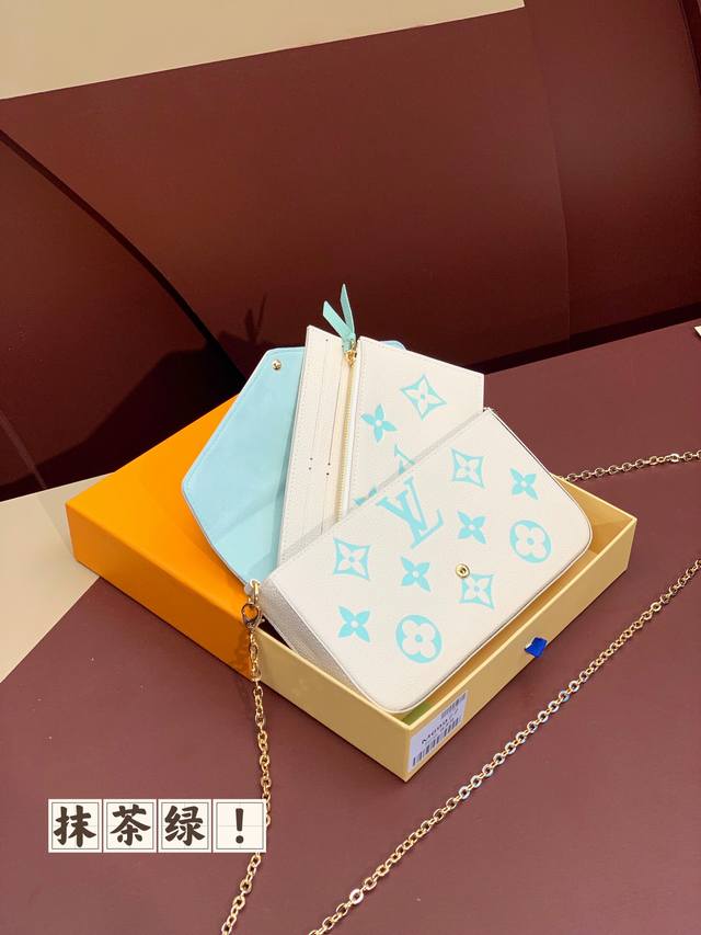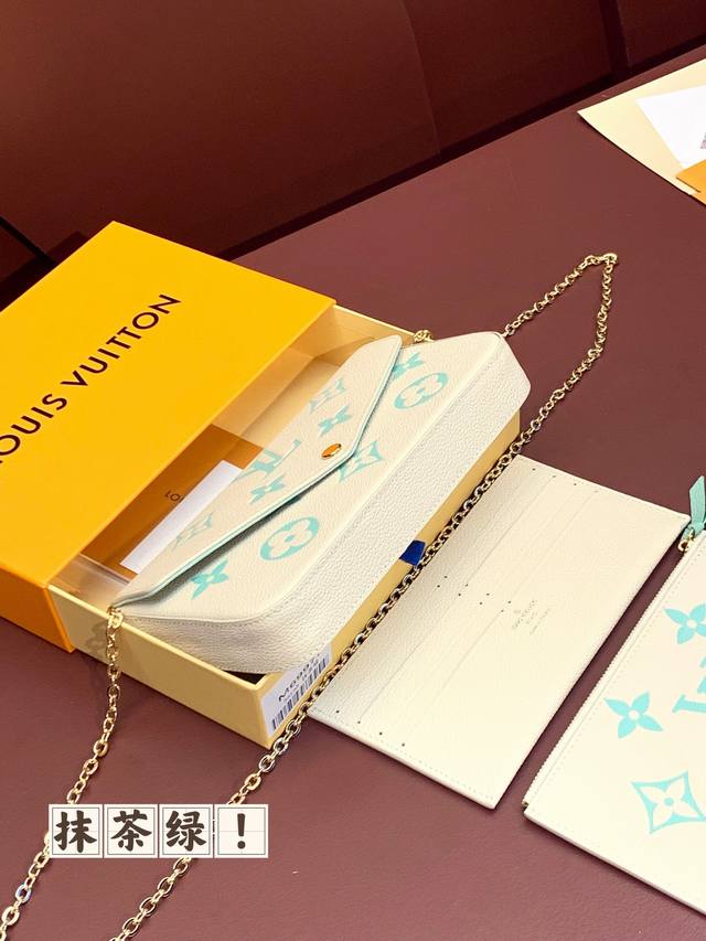 出厂价 M69977 抹茶绿!三件套、本款 Pochette Félicie 链条包为 Monogram Empreinte 皮革描绘 Monogram 印花,