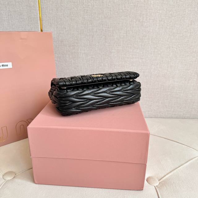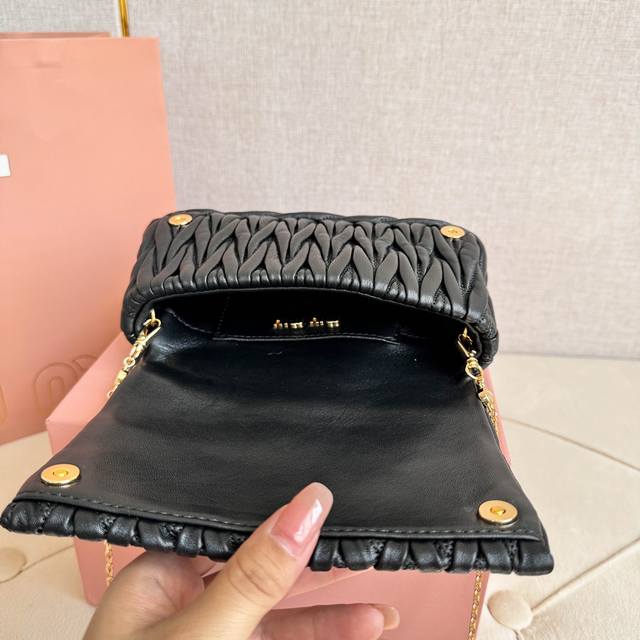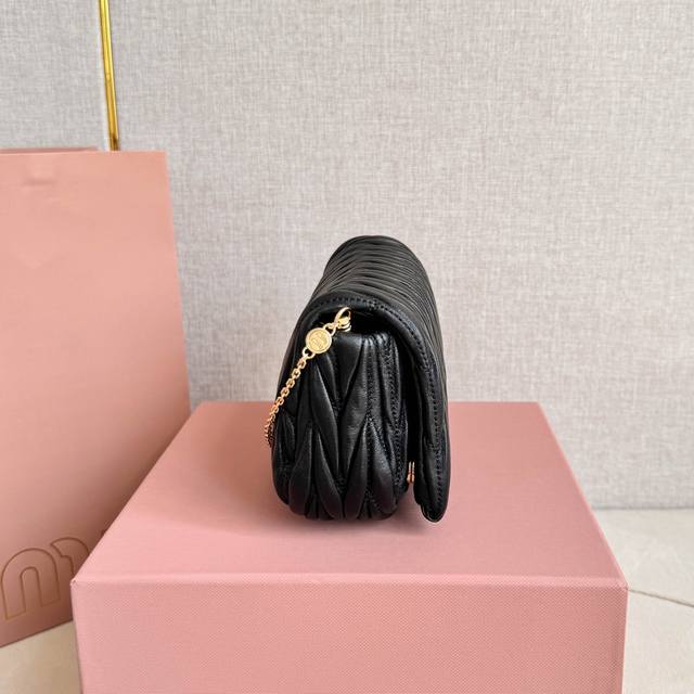 Miu Mi 新品链条包,顶级进口小羊皮,品牌经典标志性matelasse纹理绣花,新设计可拆卸金属链条长肩带,翻盖吸扣开合,内里一个卡位隔层,绵缎衬里,可手拿