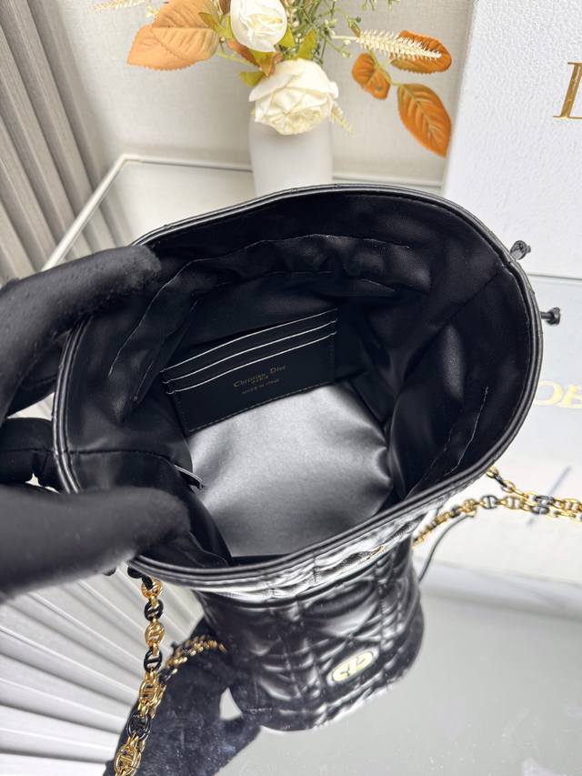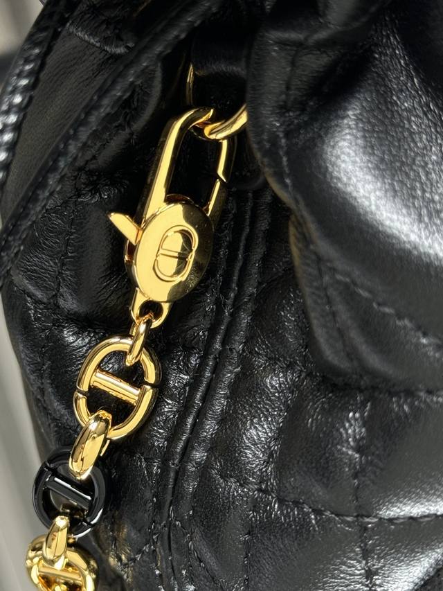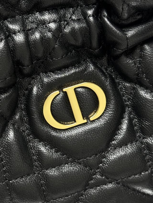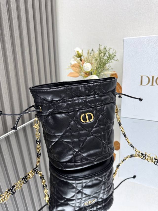 这款迷你抽绳水桶包是二零二五早春成衣系列新品,以休闲优雅的设计丰富dior Caro 系列。采用黑色羊皮革等材质精心制作,正面饰以超大藤格纹辑面线和cd标志,搭配抽绳隔层,可收纳各种日常用品,搭配可调节链条肩带,以复古金色饰面金属链环和与皮革同色调的珐琅链环交替打造,搭配皮革带更添舒适,可手提,肩背或斜挎,