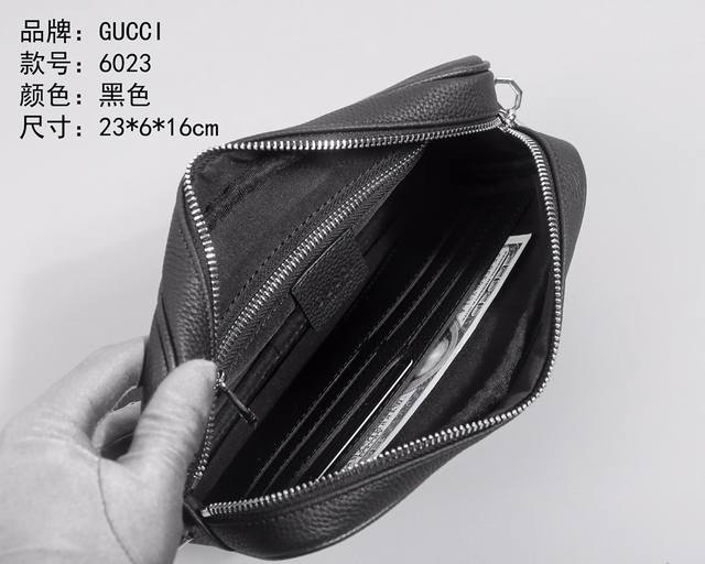 款号6023,最新,最火爆,最多功能,最实用的一款男式时尚包,内格有拉链,有多个卡位,收纳空间足够,设计闭合开口处宽,方便收纳物件,一款能解决一年四季所有生活需要,上下班,逛街,出差,旅游,休闲,适合各种环境场合,可斜背,手拿,手夹,包包采用进口皮料,特制五金配件,做工精致,完美包装配套,尺寸适合所有身材可用24×6×16
