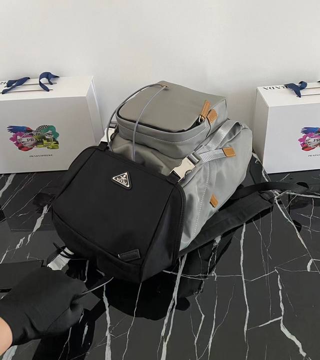 独家首发2Vz135黑灰双肩背包最新配色这款尼龙背包饰有saffiano皮革饰边,用创意与科技打造别致格调。顶级拉丝五金多个口袋和科技材质加衬背面颇具设计特色。