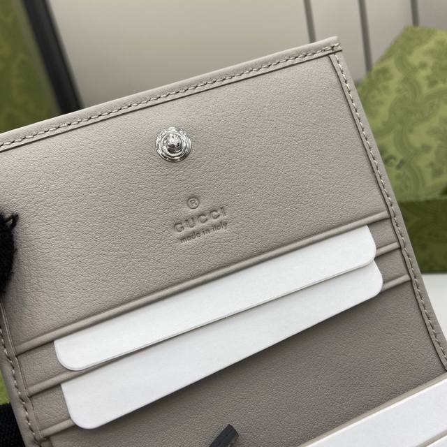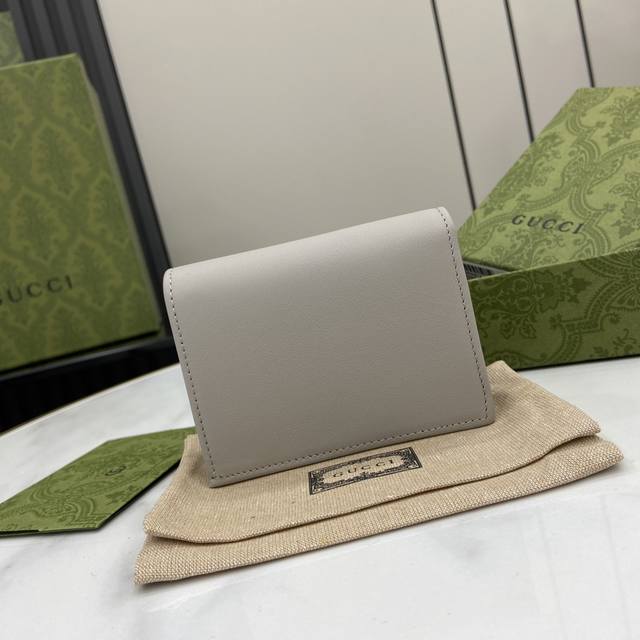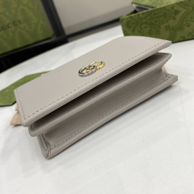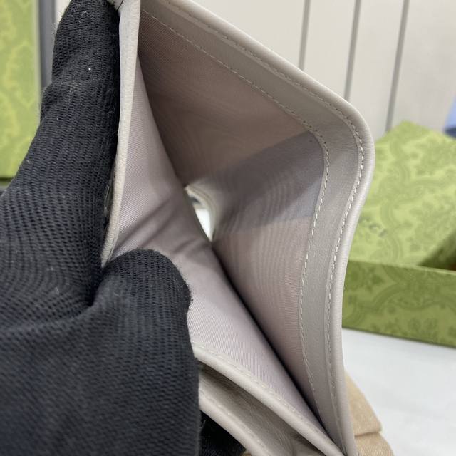 配全套原厂绿盒包装 新品 Gg Marmont系列卡包。这款gg Marmont系列卡包采用浅灰色皮革匠心制作,缀饰迷你尺寸品牌经典双g字母交织造型配件。这款钱包采用按扣开合,内部设有多个卡片隔层和口袋。浅灰色皮革,钯金色调配件,云纹织物衬里,双色调双g,五个卡片隔层、一个开口袋、一个拉链袋和一个钞票隔层,按扣门襟,重量:约0.112千克。