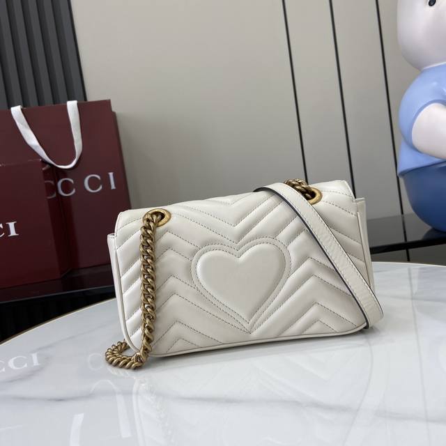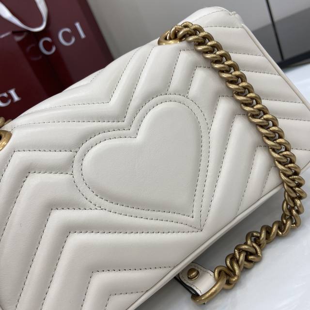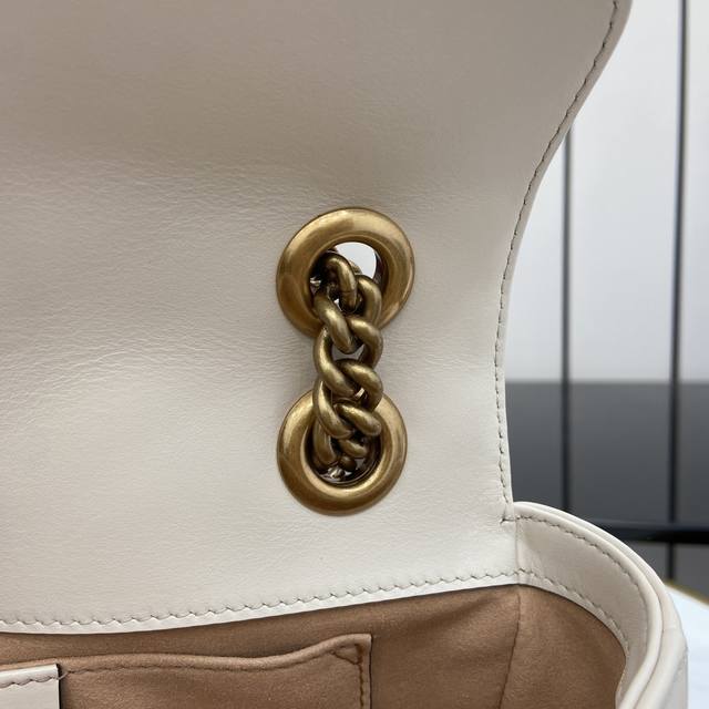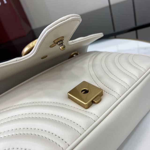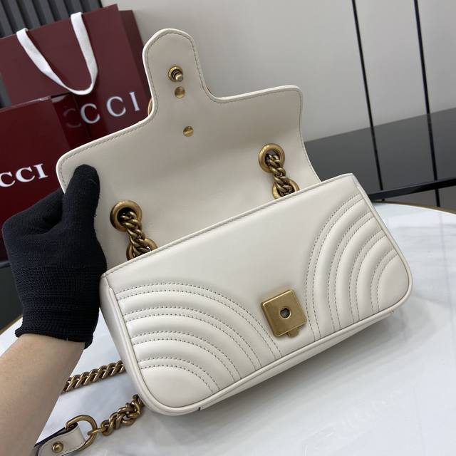 配全套原厂绿盒包装 原厂皮 新品 Gg Marmont系列绗缝迷你手袋。这款gg Marmont系列迷你手袋采用高辨识度造型、中性白色绗缝v型皮革材质,包身略显挺括,翻盖开合设计,配有双g配件。这款手袋采用了多样化背法设计,轻松滑动金属链即可在肩背包与手提包之间自如切换,白色绗缝v型皮革,金色调配件,绒面材质超细纤维衬里双g,滑链包带可作为肩带 55厘米高 或顶部提手 30厘米高 使用。也可作为斜挎包使用。弹簧扣翻盖,重量:约0.6千克。