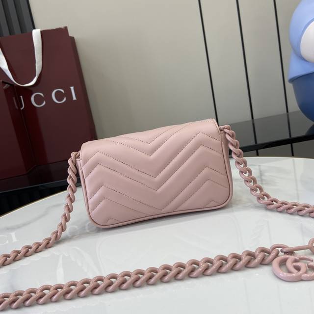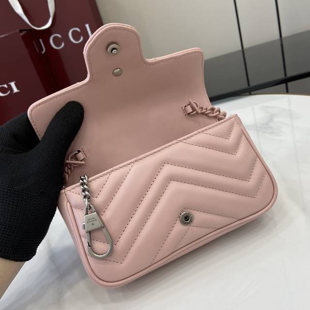 配全套原厂绿盒包装 新品 Marmont链条马卡龙系列白色迷你手袋,配有钥匙扣,可以用于将此袋绑缚在另外更大的手袋上。采用颇具结构化的柔软造型,翻盖扣配以gg金属配件。金属配件从70年代经典设计中汲取灵感。采用绗缝人形花纹真皮制作。