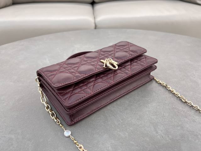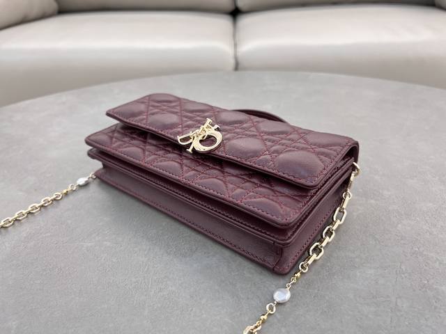 这款手拿包是本季新品,顶部搭配手柄,优雅实用,令 Lady Dior 系列更加丰富。采用酒红羊皮皮革精心制作,饰以藤格纹,翻盖设计搭配d.I.O.R.吊饰提升格调。款式实用,设有多个隔层和卡槽,可收纳各种日常用品,是日装和晚装的理想良伴。顶部手柄,可拆卸链条以珠饰点缀更显精致,可手提或斜挎。尺寸:21 X 11.5 X 4.5 厘米