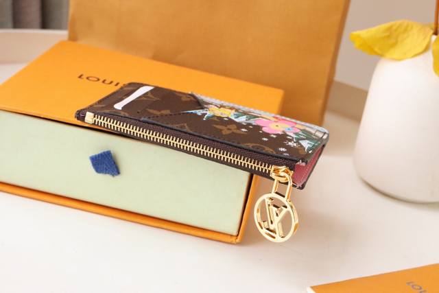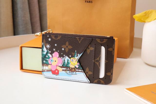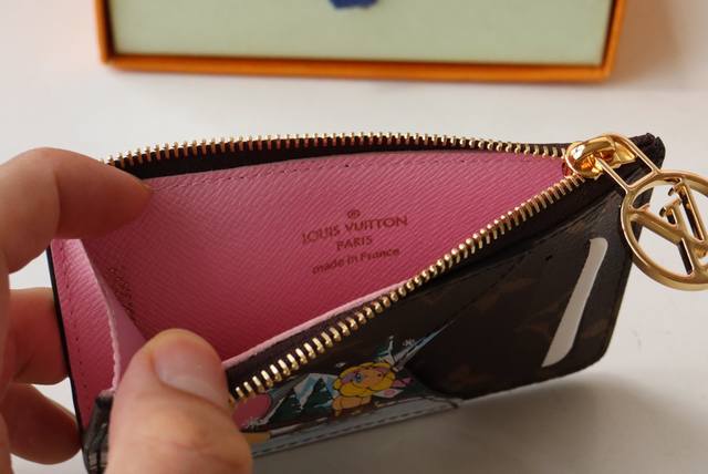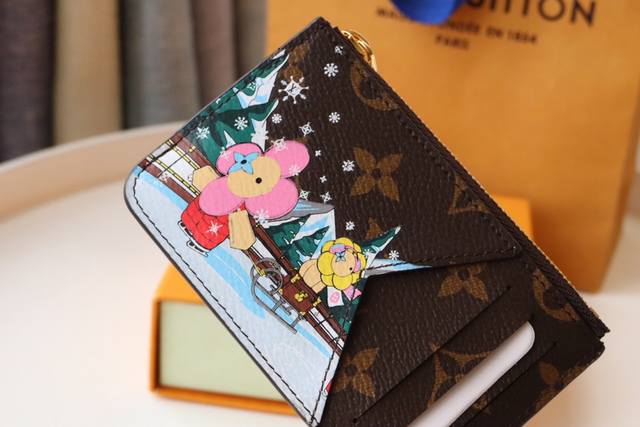 庆祝运动乐趣的限量版“卡盒波尔图卡罗米”。用单幅画布缝制,印制了路易 维顿的受欢迎吉祥物“维安娜”和她的朋友在滑冰上探索山区的形象。可存放纸币、硬币、收据等的带有拉链的袋子,拉杆上带有金色的lv圈。尺寸:12X8X0.8Cm