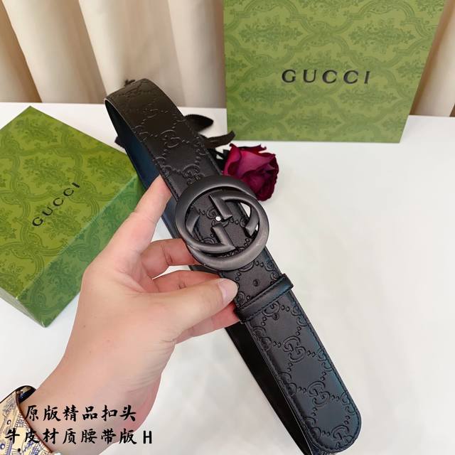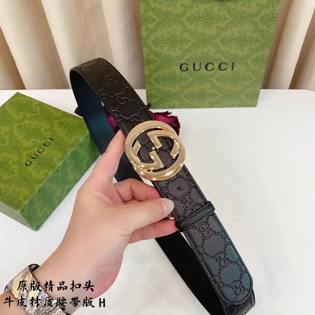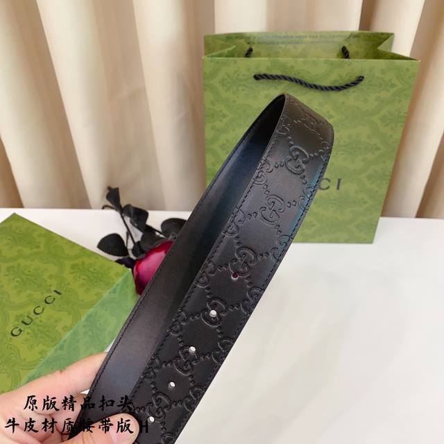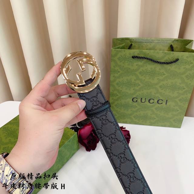 原版品质打孔 品牌:古奇g家 男款 颜色:黑 扣头:金 银 黑 扣头:原版精品纯铜五金扣头 带身:原版牛皮 尺寸:宽约:3.8Cm 长约:95Cm-125Cm