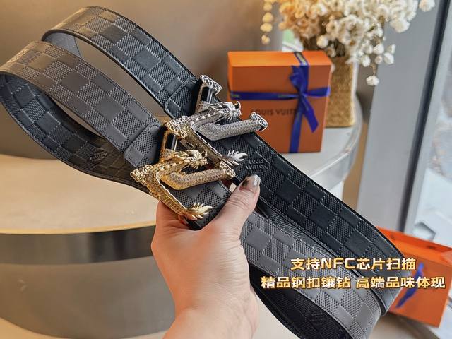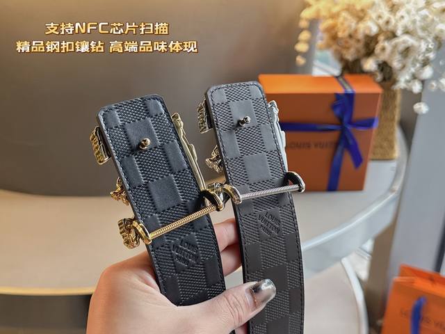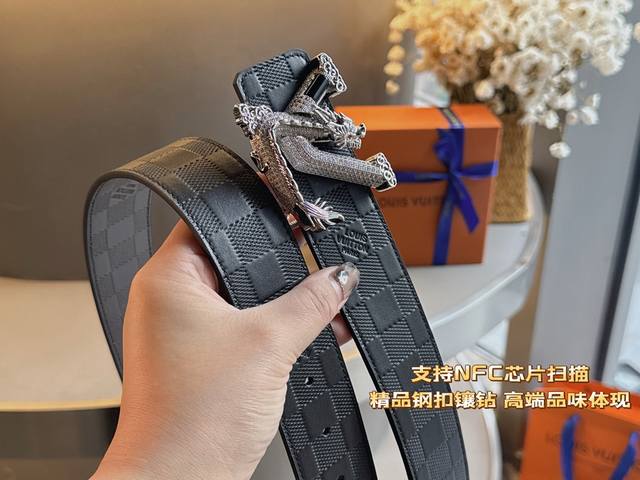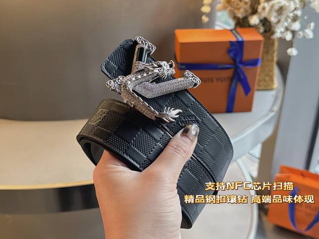Lv高端定制配带全套原版包装 材质 : 台湾面料搭配进口牛皮 搭配18K钢扣手工镶嵌洛世奇钻 超级闪永不过时 颜色 黑配咖啡色双面可用 规格 :3.8Cm 卖点 :皇家御用经典款式,质感卓越,高级造工 手感极佳,商务休闲两相宜,英伦风格,呈现出奢华帅气。完美出品,即转即赚。支持nfc芯片扫描