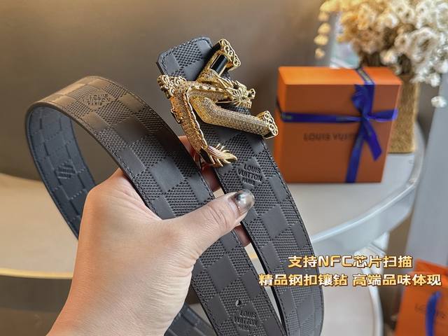 / Lv高端定制配带全套原版包装 材质 : 台湾面料搭配进口牛皮 搭配18K钢扣手工镶嵌洛世奇钻 超级闪永不过时 颜色 黑配咖啡色双面可用 规格 :3.8Cm 卖点