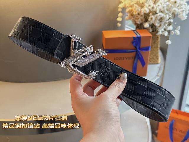 Lv高端定制配带全套原版包装 材质 : 台湾面料搭配进口牛皮 搭配18K钢扣手工镶嵌洛世奇钻 超级闪永不过时 颜色 黑配咖啡色双面可用 规格 :3.8Cm 卖点
