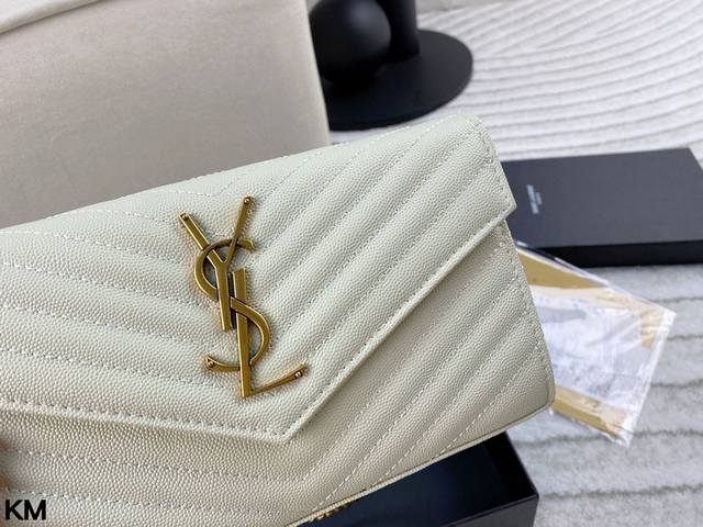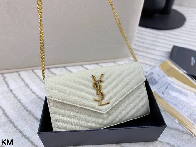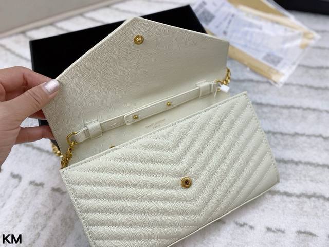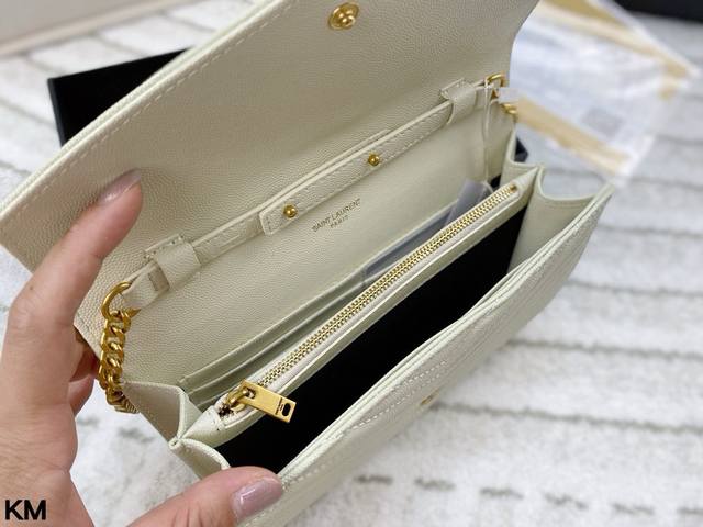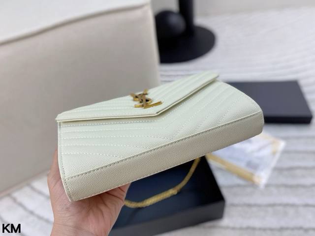 / 配盒 Ysl Woc鱼子酱信封包 链条可以调节成斜挎背、单肩、腋下背 鱼子酱皮的颗粒感 肉眼看起来很强 摸起来却很丝滑舒服 包包内侧有很多卡位适合放卡 低调百搭