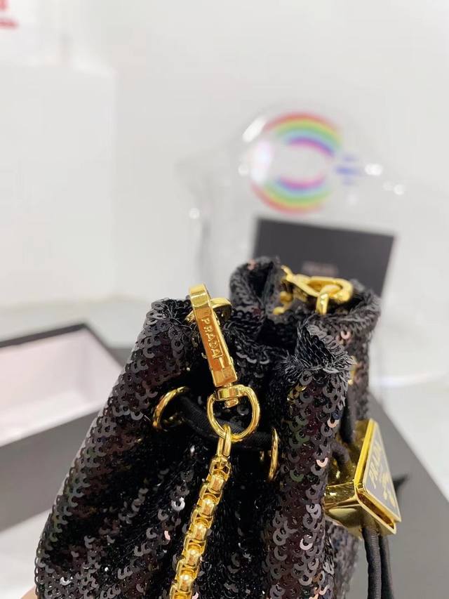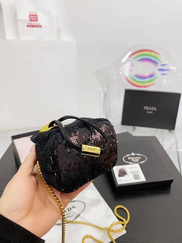 配盒 尺寸10.13 普拉达prada Mini亮片水桶包 太可爱了,Bling Bling的效果非常吸睛 可仙可酷,难道你不心动。 太美太可爱了