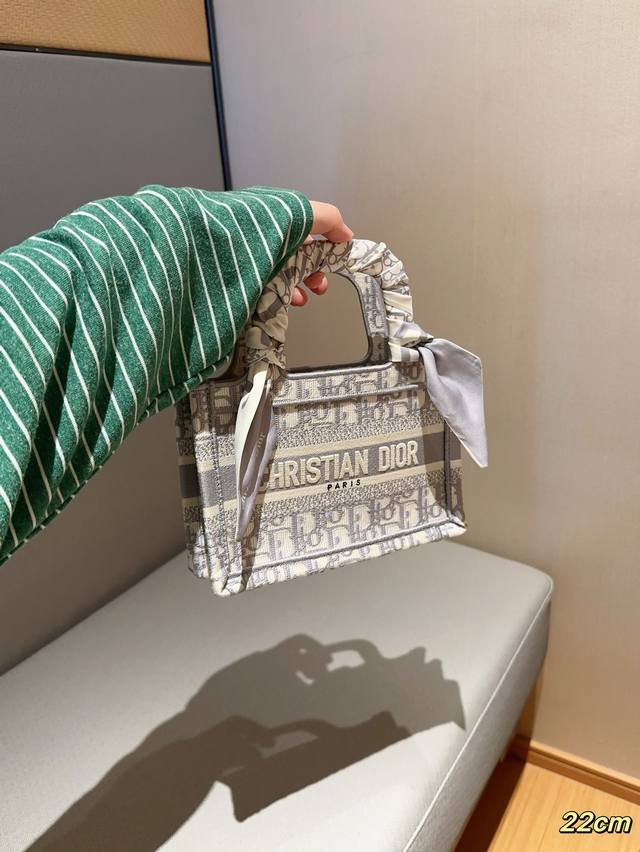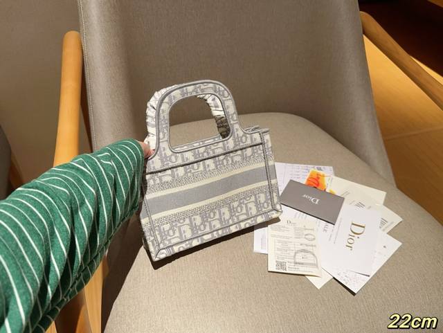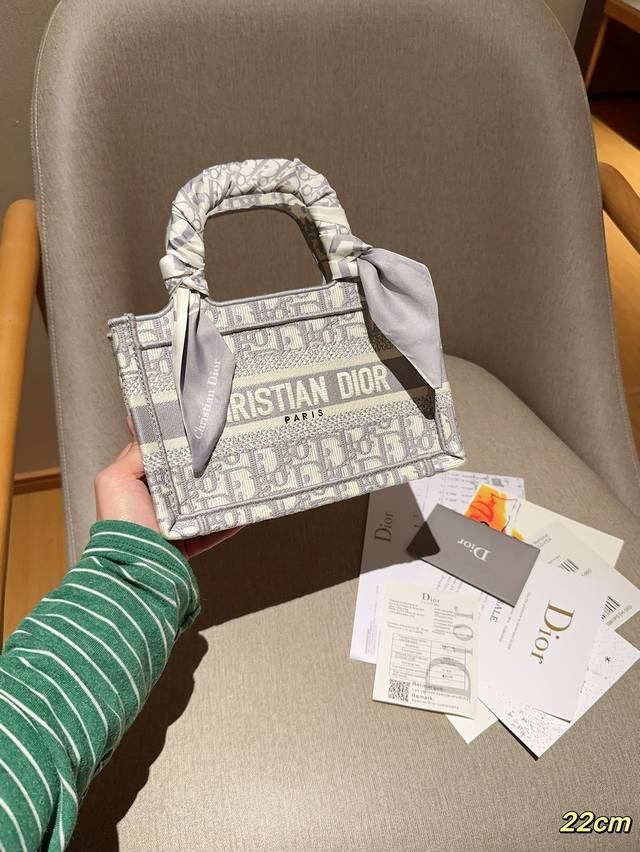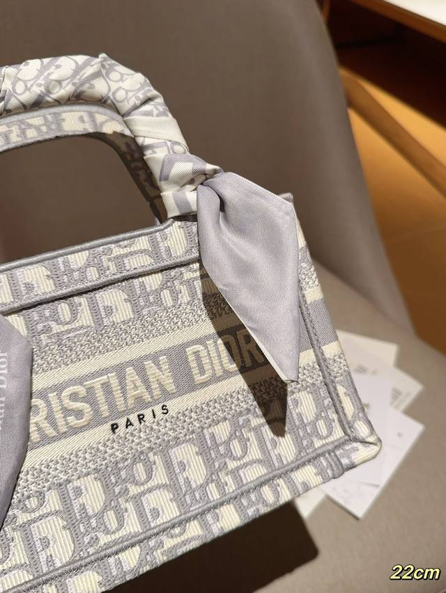 配送丝巾 Dior迪奥 迷你托特包mini Tote Book Tote 茹伊灰色字母印花刺绣提花 尺寸22Cm 礼盒包装