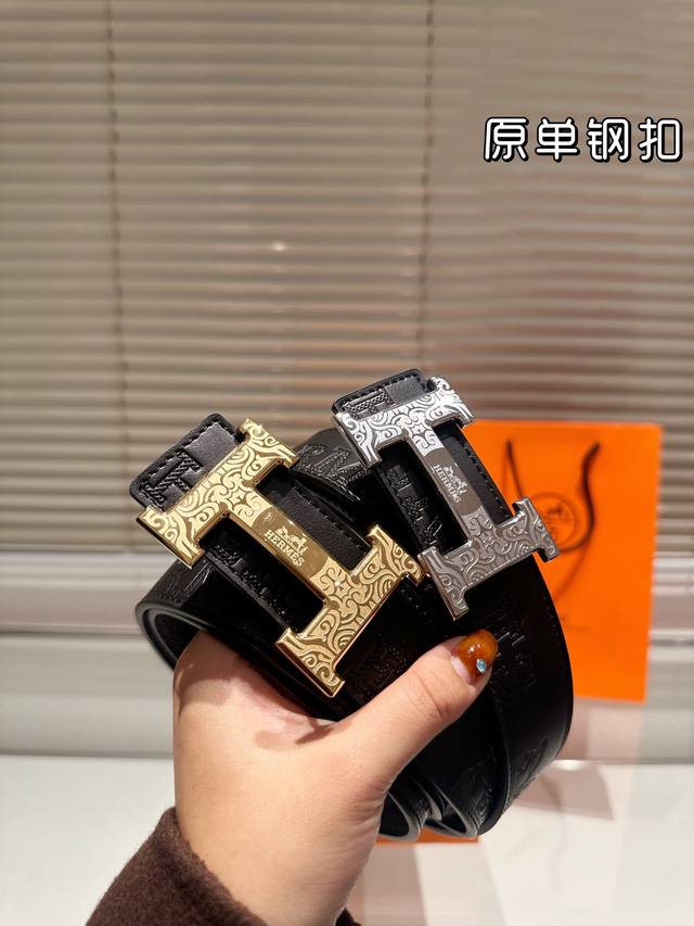 钢扣 高版本!腰带爱马仕牛皮皮带~热门款 男女通用皮带里面最火的版本啦~质量很好 全套包装!五金绝对不褪色 皮带头和专柜一样的哦~ 配礼盒手提袋发票