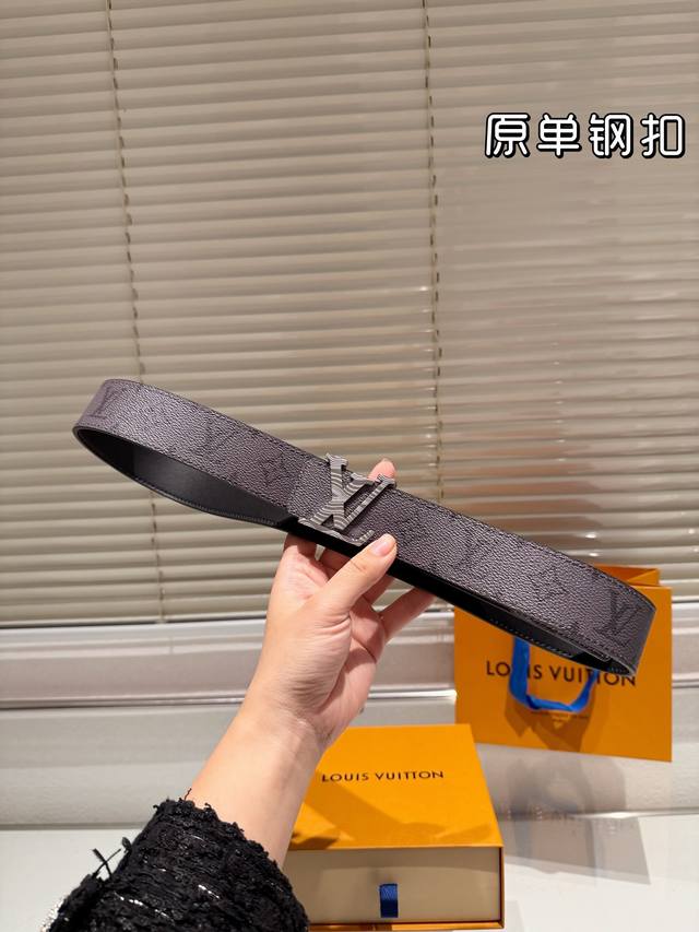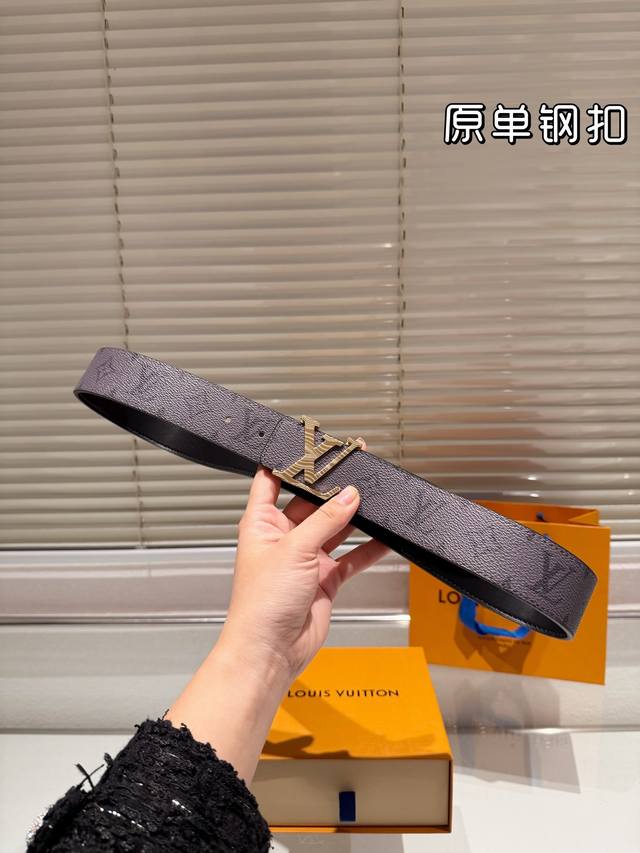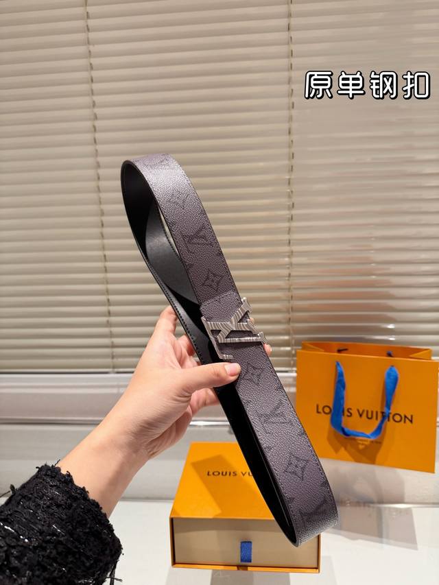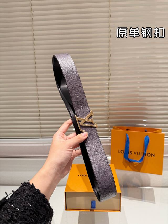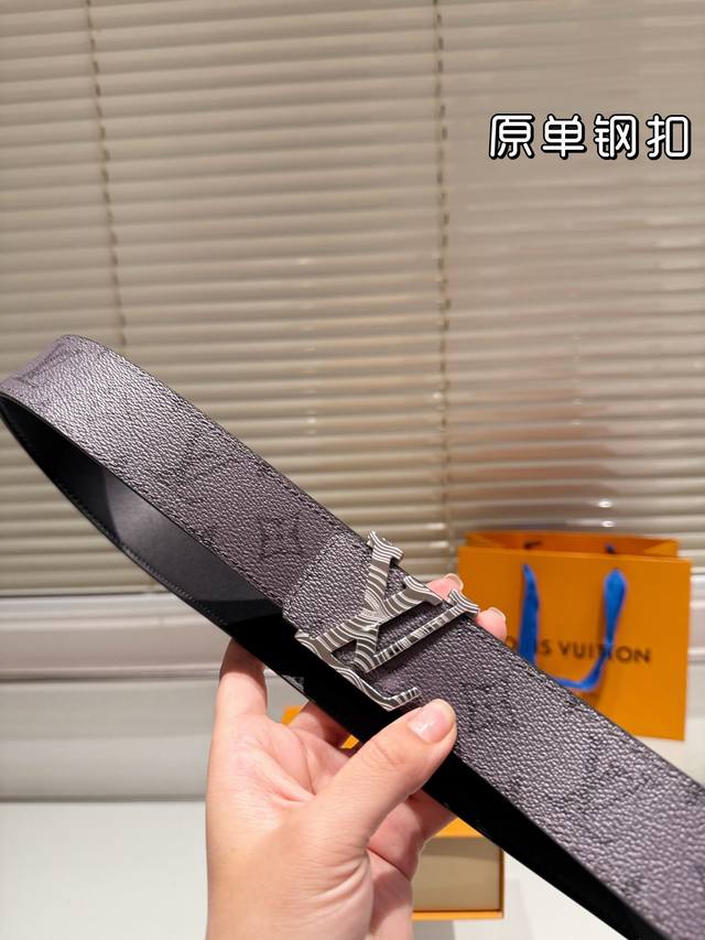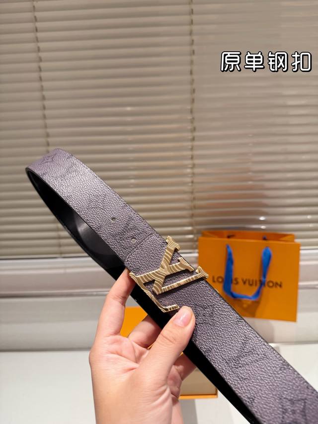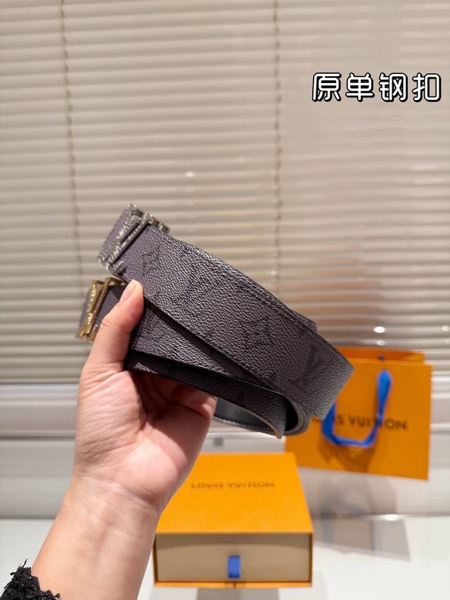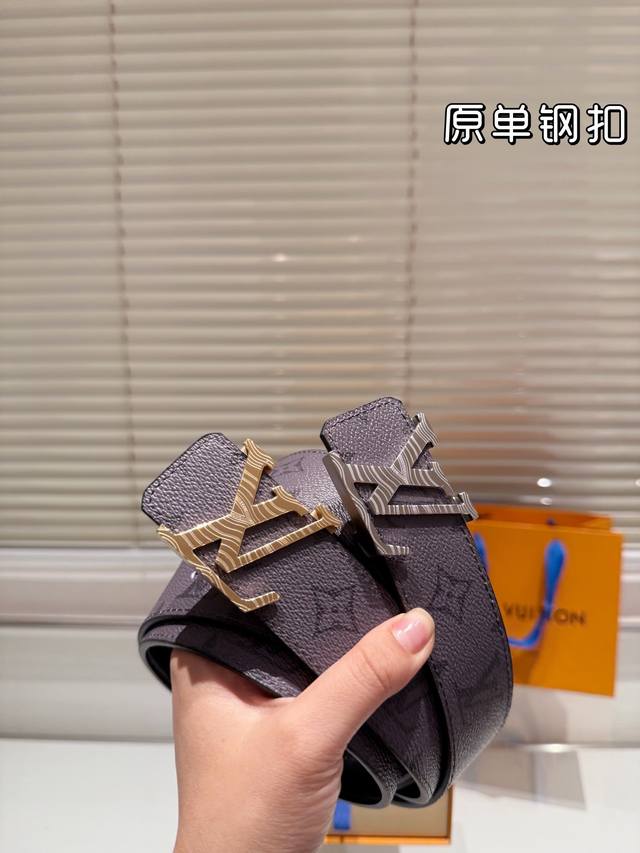 钢扣 高版本!腰带lv牛皮皮带~热门款 男女通用皮带里面最火的版本啦~质量很好 全套包装!五金绝对不褪色 皮带头和专柜一样的哦~ 配礼盒手提袋发票