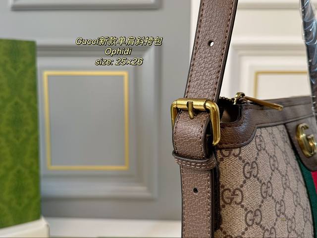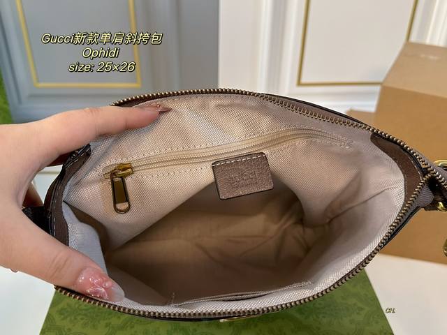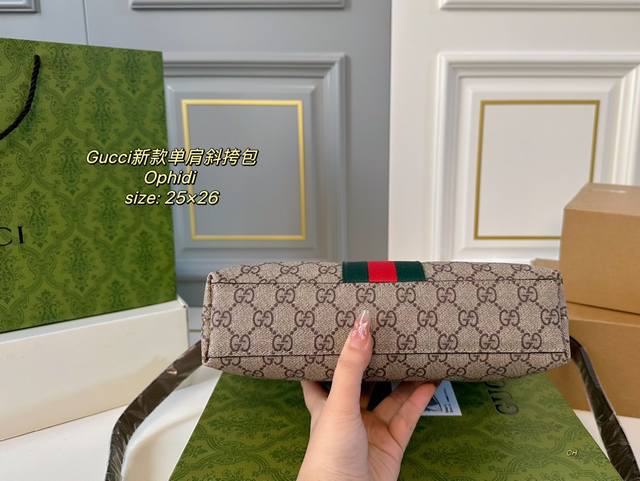 配盒 Size:25×26 Gucci 古驰老花ophidi单肩斜挎包 方方正正的包型很好搭衣服! 经典双g标识,辨识度超高 肩带调节,空间超大~ 出门超方便,
