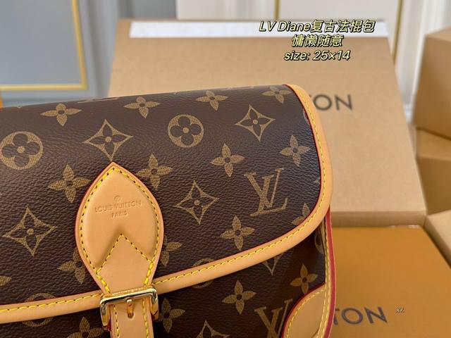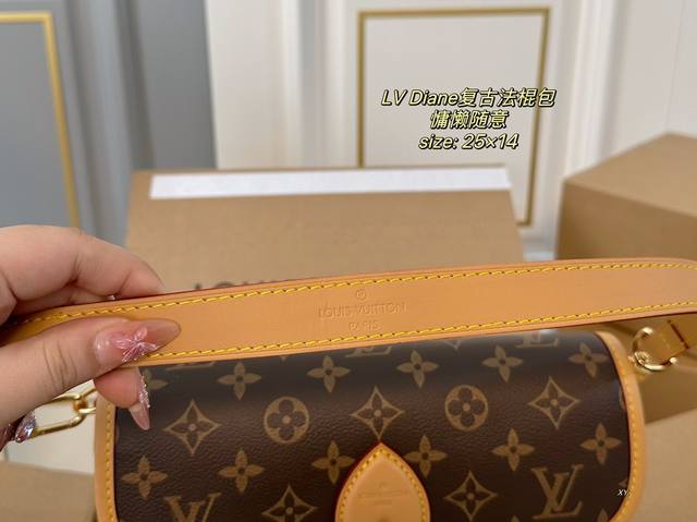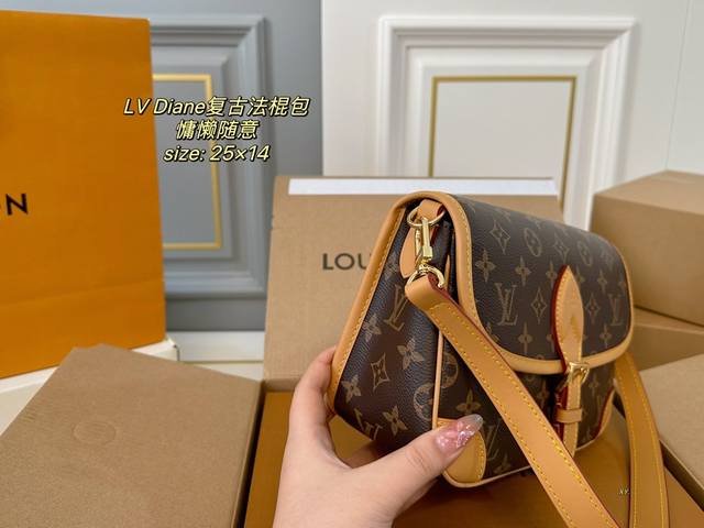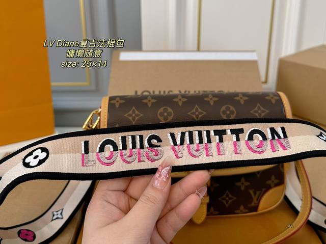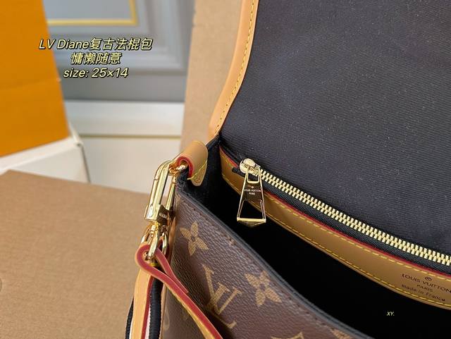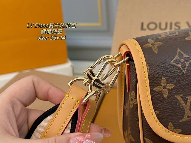 / 折叠盒飞机盒 Size:25×14 Lv路易威登diane复古法棍包 搭配两条肩带,腋下斜挎、 皮带扣设计复古经典,超级实用~ 简约的包型,可盐可甜,慵懒又随意