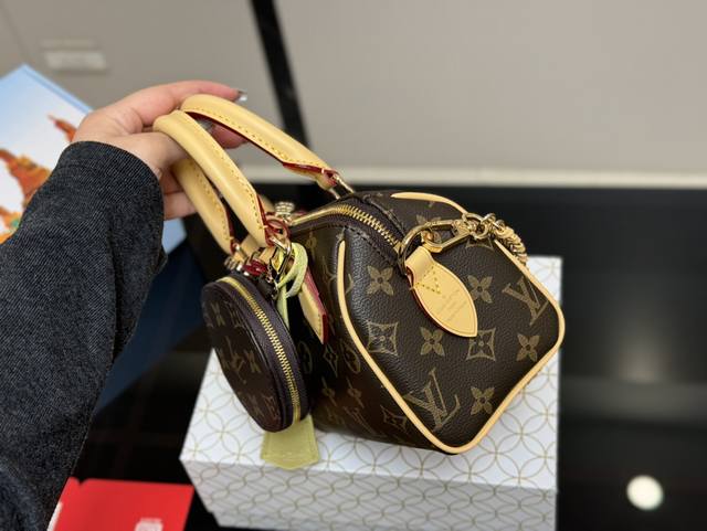 新款 配折叠盒飞机盒 Size:18Cm Lv Speedy Nano 代购渠道 台湾客定老花+五金+黄皮 肩带可以拆卸和调节长短哦!