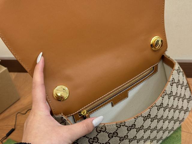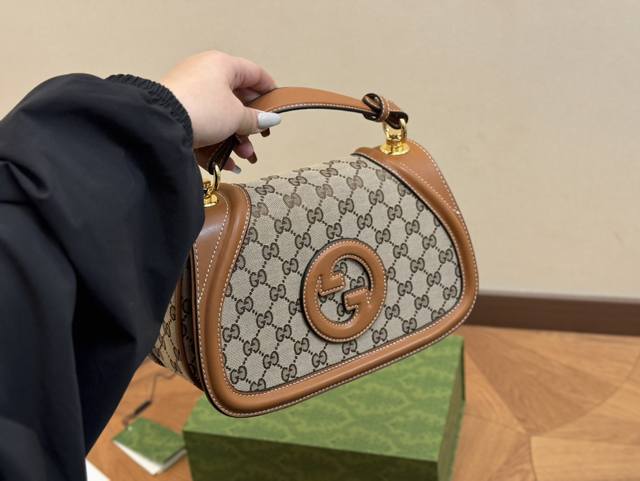 礼盒包装 Gucci 漆皮Blondie 链条马鞍包手提款 滚边设计,珐琅色浅金色配件圆形浮雕互扣式双G 翻盖磁吸扣开合,棉麻衬里内部...