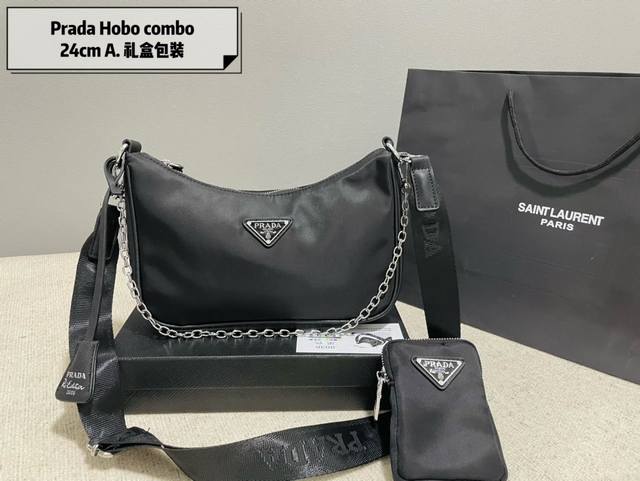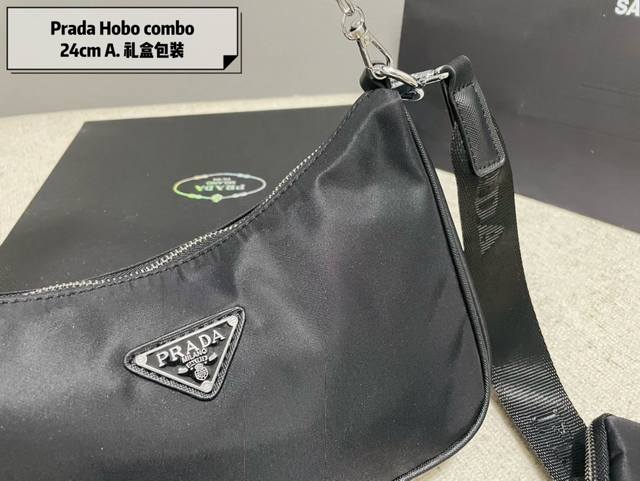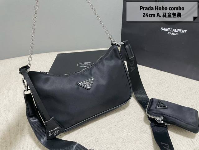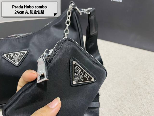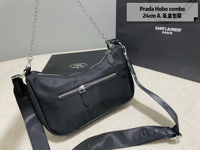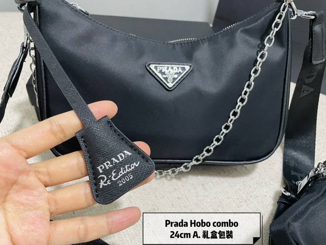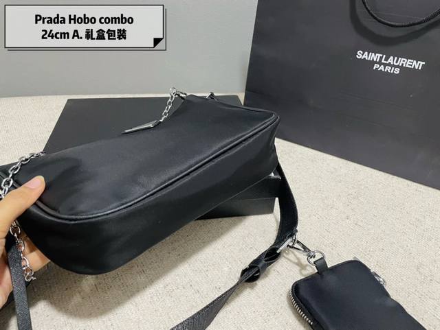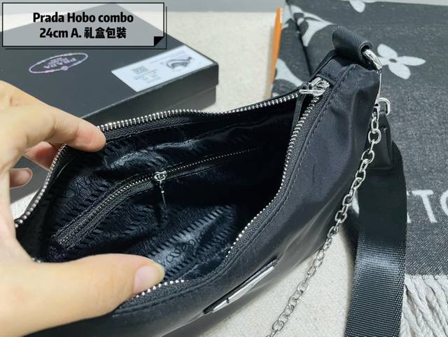 Prada Hobo Combo 今年的新款hobo Bag 有可调节长度的 尼龙刺绣logo肩带 +链子 五金采用原版白钢 不褪色 解锁更多搭配 超精致的一款包包 值得种草 拍照的时候直接就想自留了 肩带上的小包可以放零钱 实在太美啦 而且超好用 推荐 推荐 尺寸24Cm