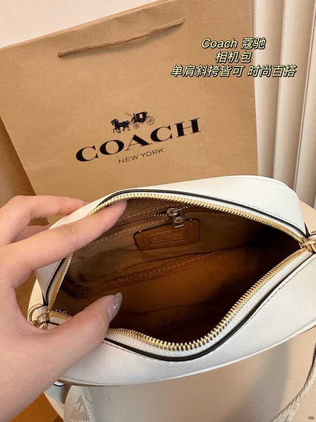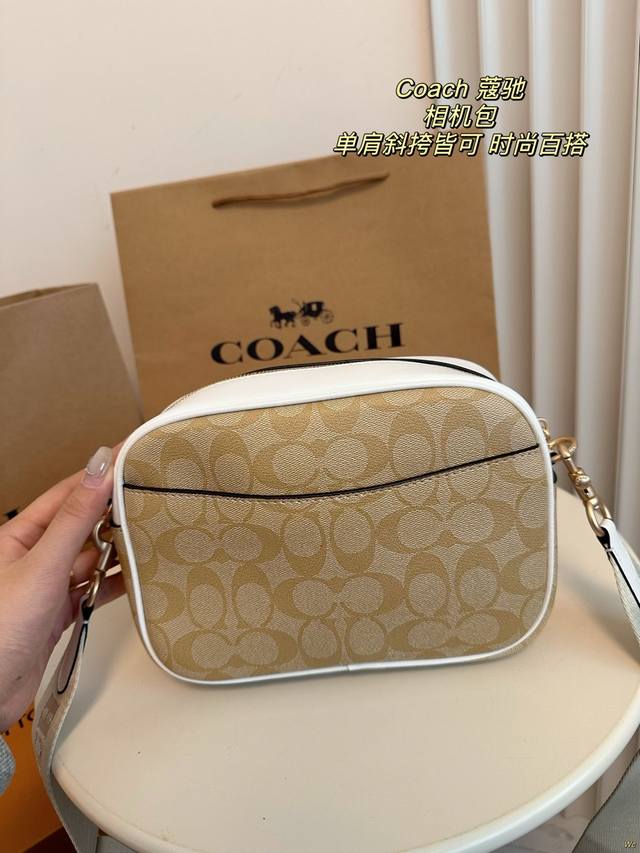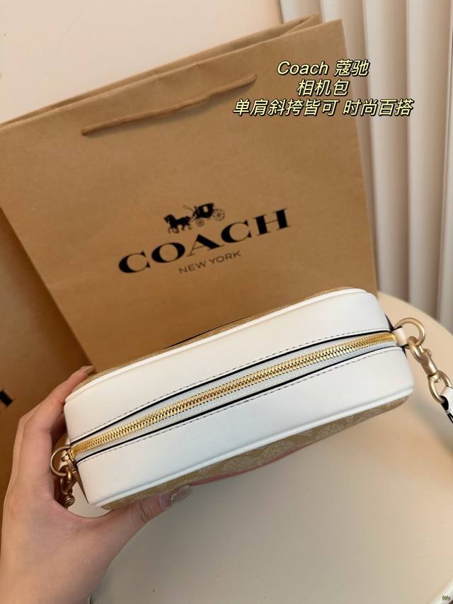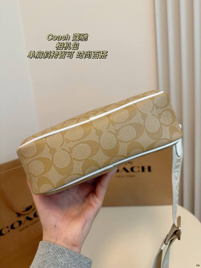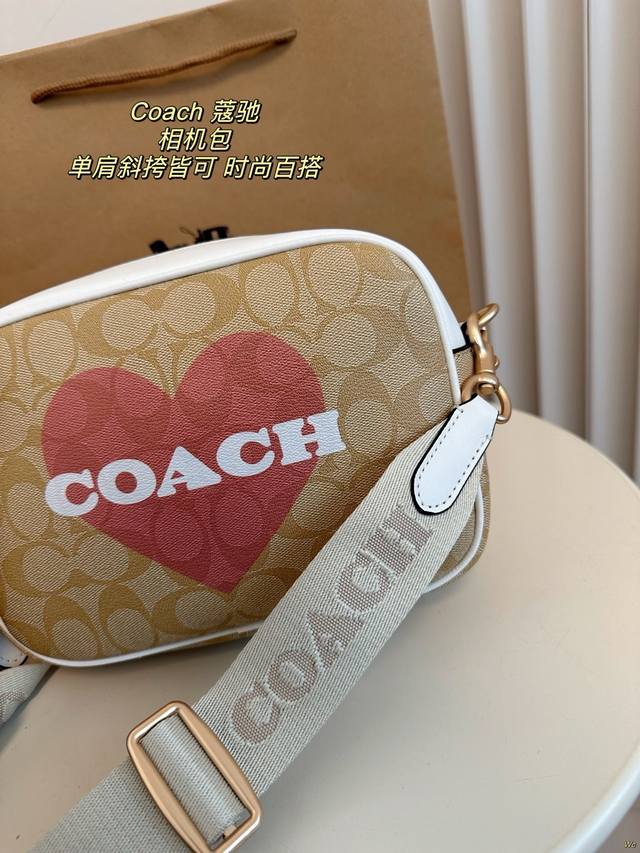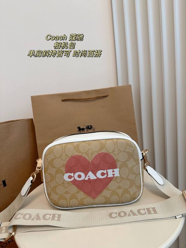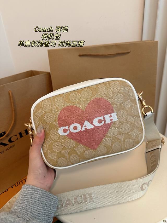 配盒 Coach 蔻驰 新款相机包 粉色爱心+白拼卡其老花,精致可爱,谁背谁好看,宽肩带可以调节长短,手机,化妆品,小钱包,钥匙等,都可以轻松放下。 尺寸:21