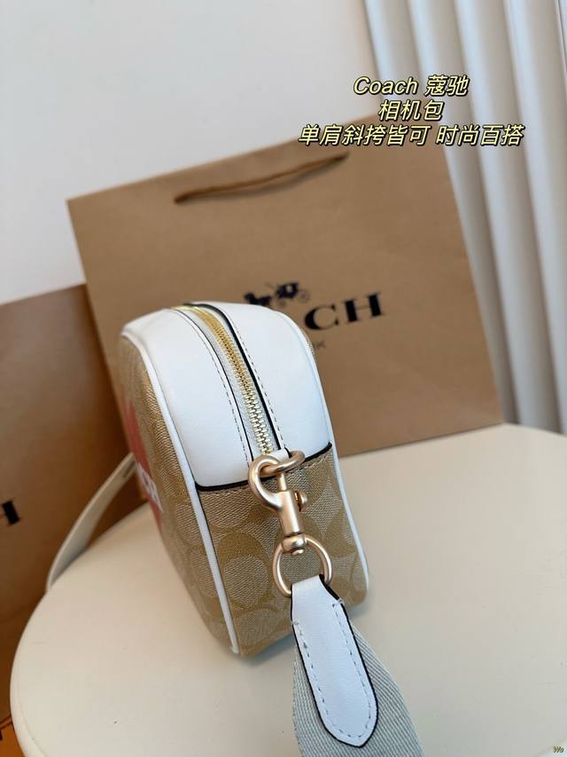 / 配盒 Coach 蔻驰 新款相机包 粉色爱心+白拼卡其老花,精致可爱,谁背谁好看,宽肩带可以调节长短,手机,化妆品,小钱包,钥匙等,都可以轻松放下。 尺寸:21