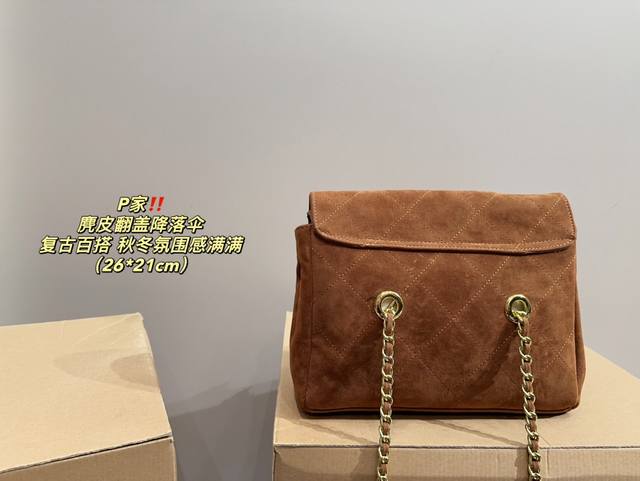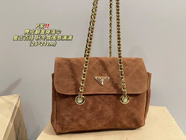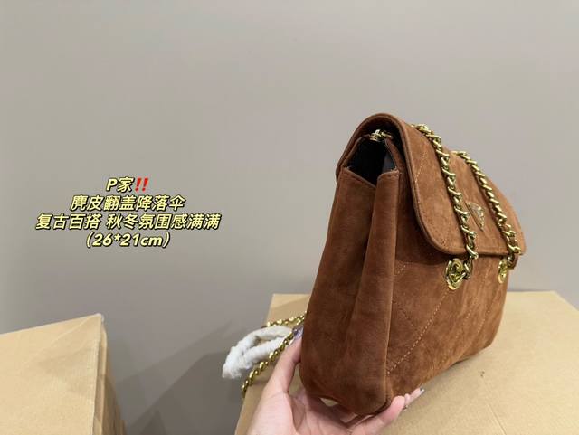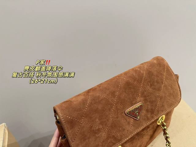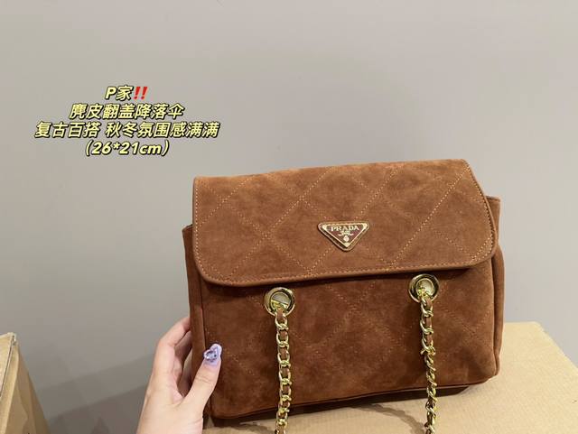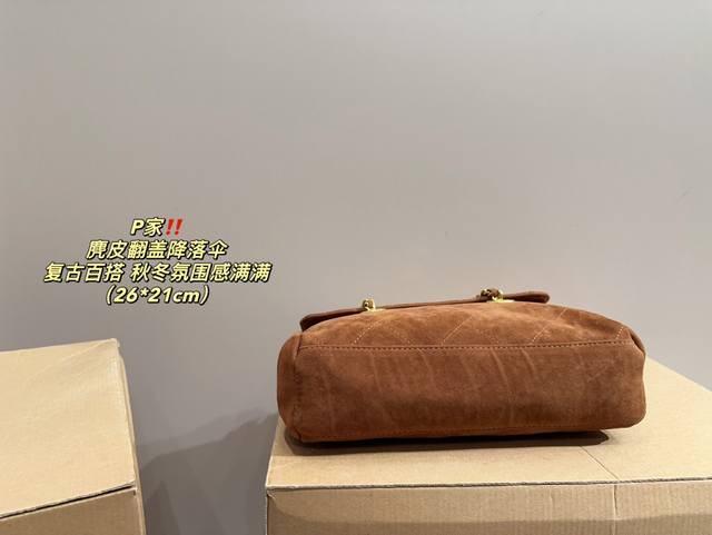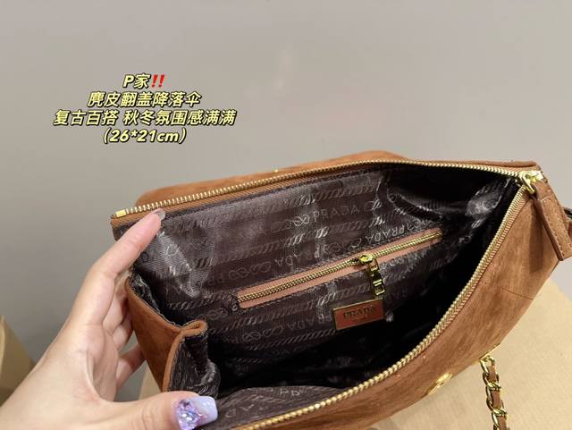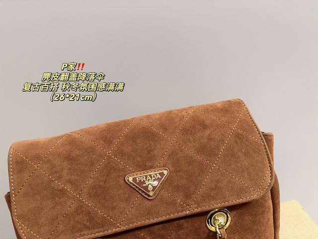 / 配盒尺寸26.21 普拉达 麂皮翻盖降落伞 Prada 质感很高级 容量超级大也很耐用 日常出街背它回头率百分百 就是这种随性慵懒感