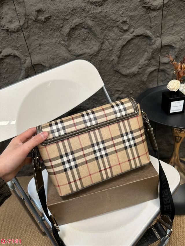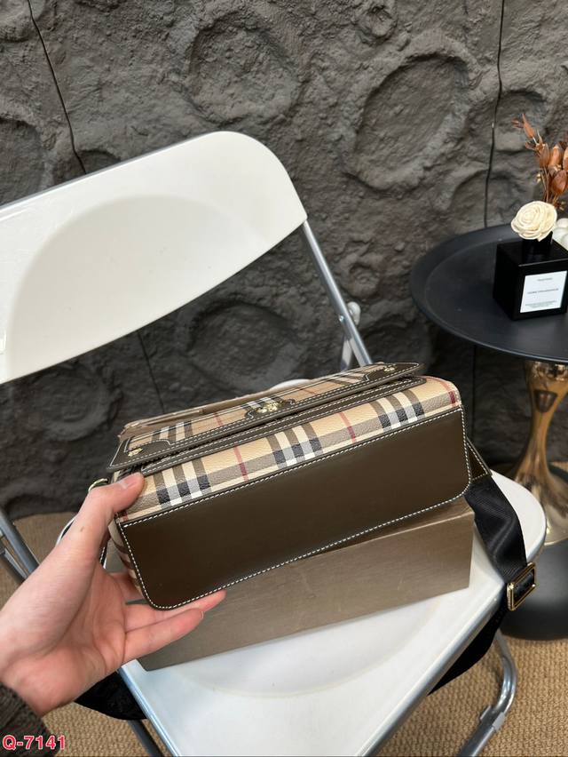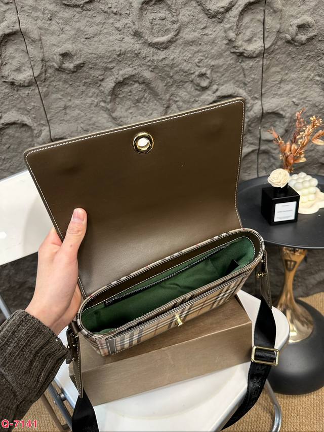 / 配折叠盒 巴宝莉burberry 橄榄绿新配色格子包 巴宝莉专柜最新款单肩斜挎包,实用耐久的面料 采特殊亚麻材质搭配牛皮四季必备 单肩斜挎背两用款 尺寸 25.