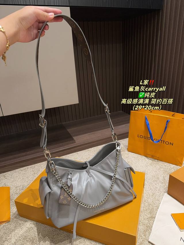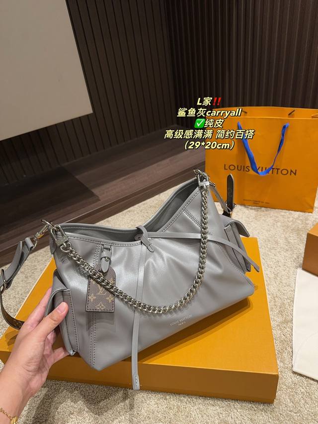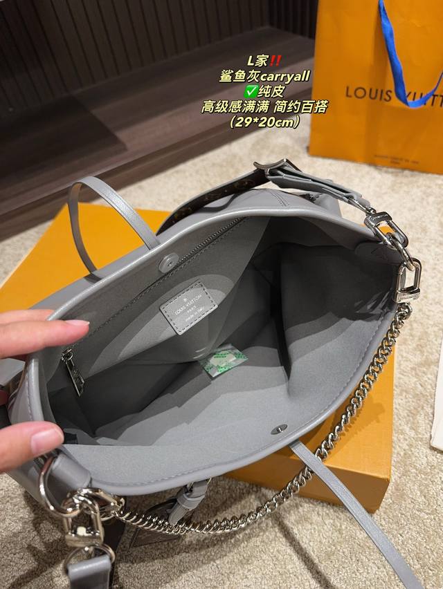 纯皮小号 配折叠盒尺寸29.20 Lv 鲨鱼灰 Carryall 链条可以直接单肩 长度刚好 斜挎搭配老花肩带 自带低调气质 新款鲨鱼灰颜色比较冷色调 男女同款