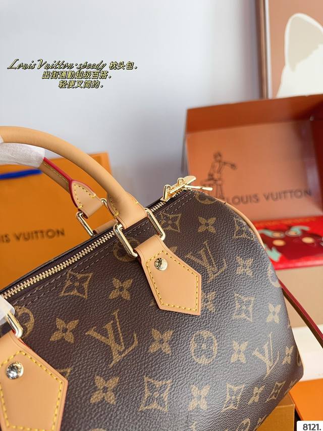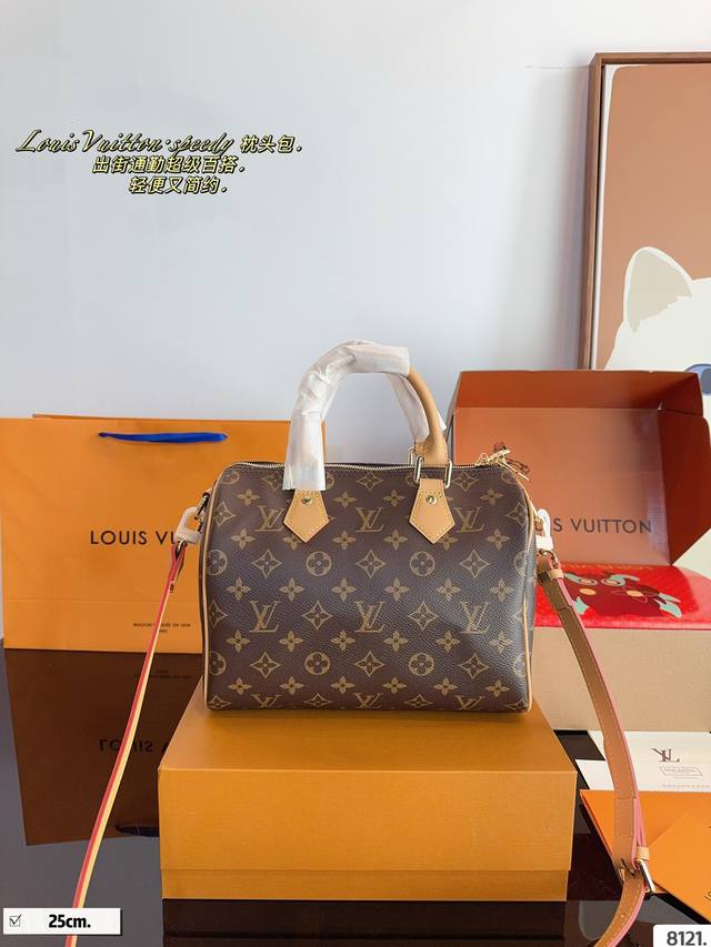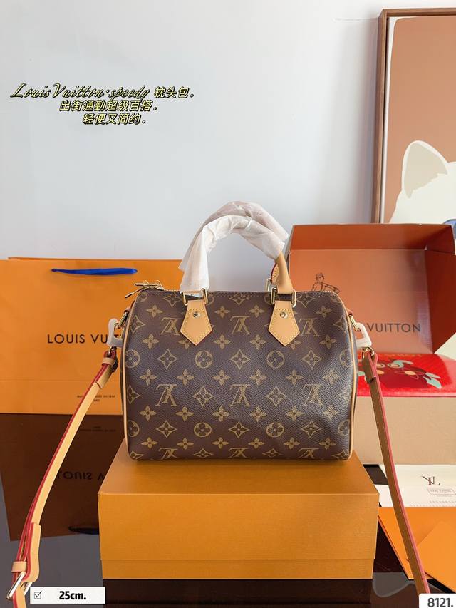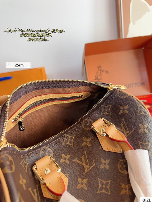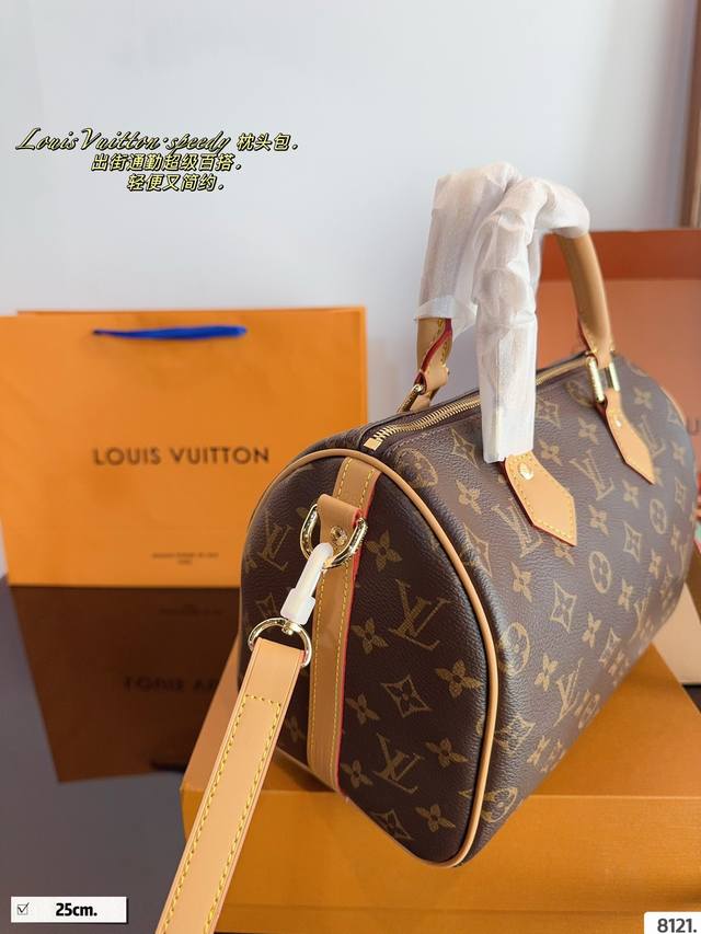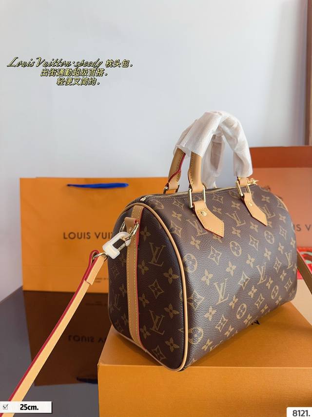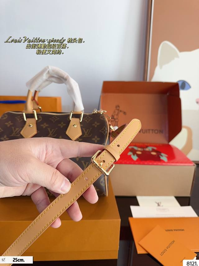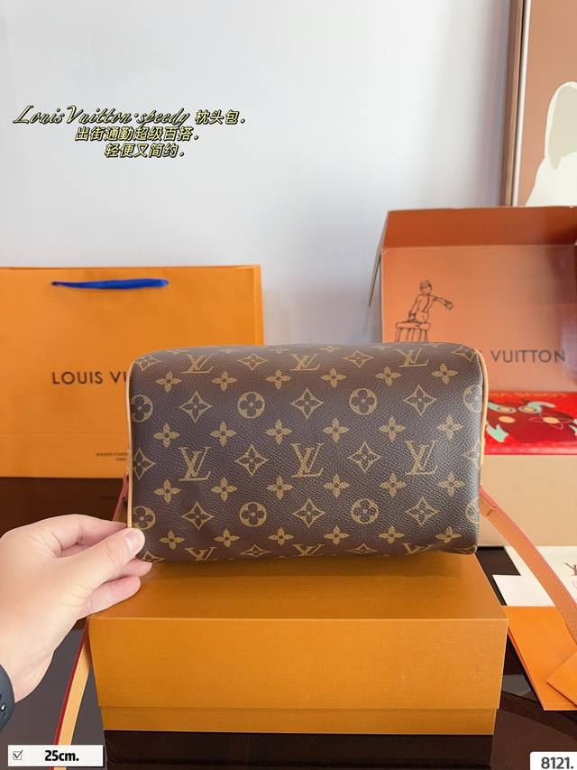 Lv Speedy枕头包 这款retiro 手袋以标志性的lv老花面料制成,搭配奢华的变色牛皮饰边,经典永恒。优雅低调的外形设计和宽敞的包 全包对花.尺寸:25*11*18Cm