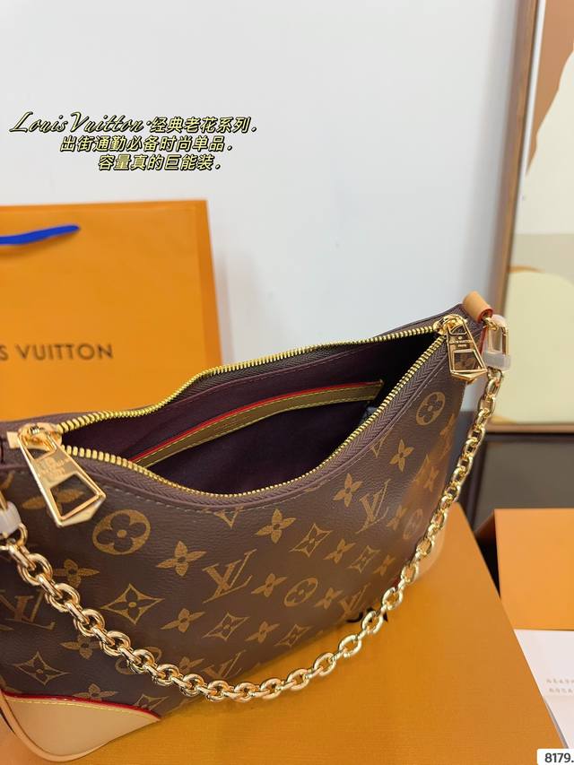 配礼盒. Lv 2024新款boulogne牛角包 拉链 老花 皮肩带 轻便 大容量▼ 斜挎 单肩 腋下 手提 一包四背,链条点8和肩带都可拆卸 刚拿到有点压扁