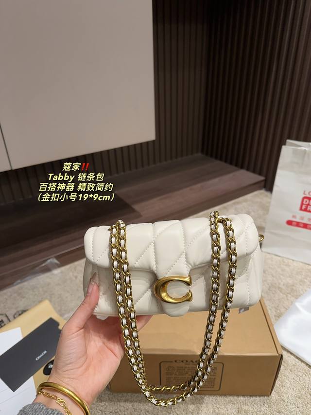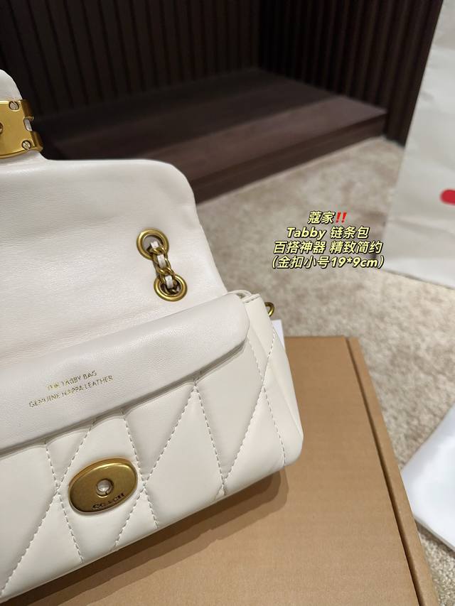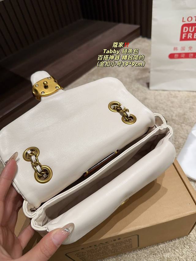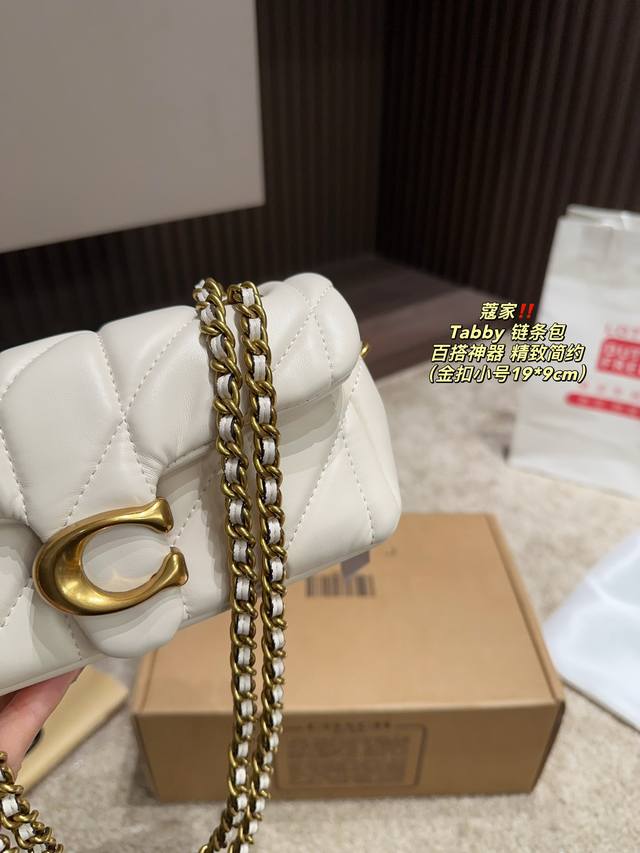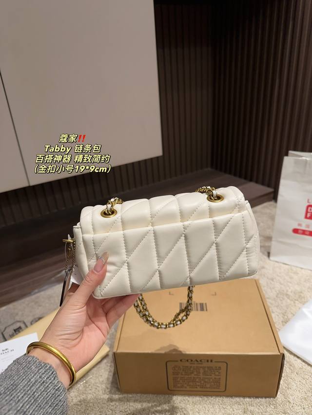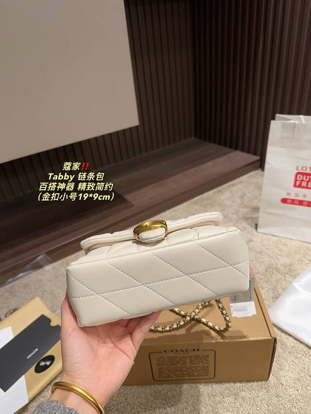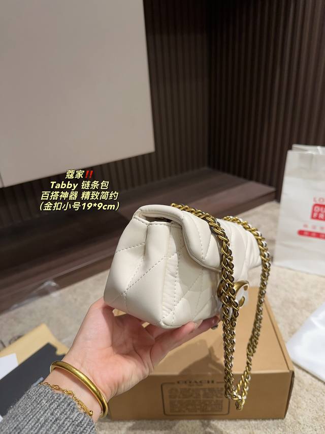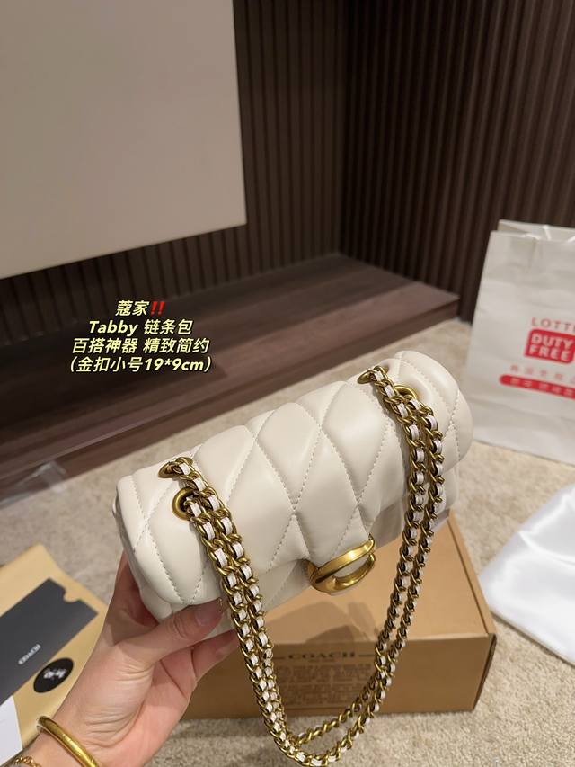 大号 配盒尺寸25.13 小号 配盒尺寸19.9 蔻驰 Tabby 链条包 Coach 链条包绝对是百搭神器 烤漆黑色搭配超有质感的小羊皮 颜值担当,谁背谁好看